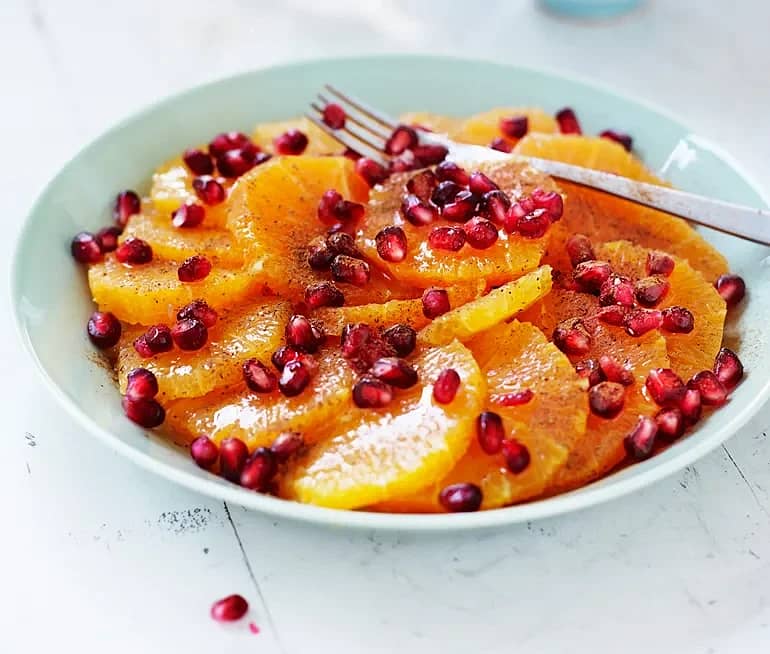 Apelsinsallad med granatäpple, honung och kanel