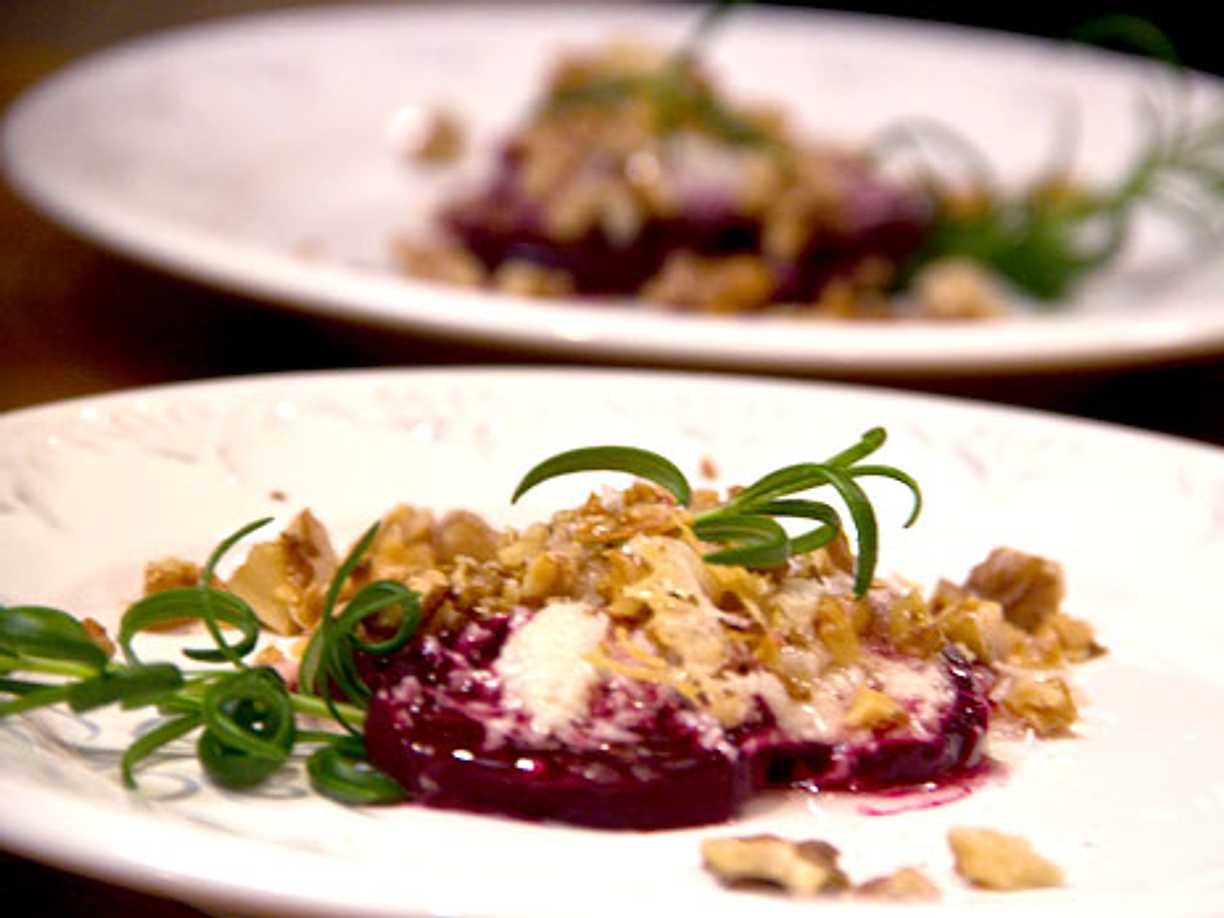 Rödbetor med chèvre, valnötter och honung