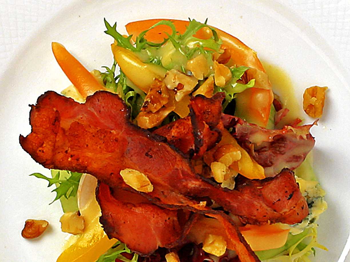 Bacon- och ädelostsallad med honungsdressing