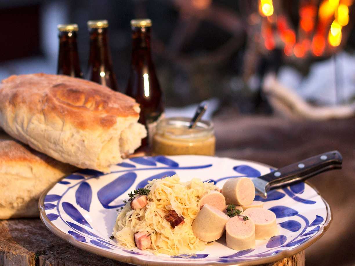 Egen surkål med fläskkorv och honungssenap