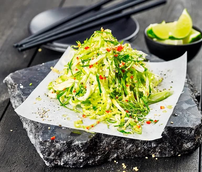Råhyvlad brysselkål med chili- och ingefärsdressing