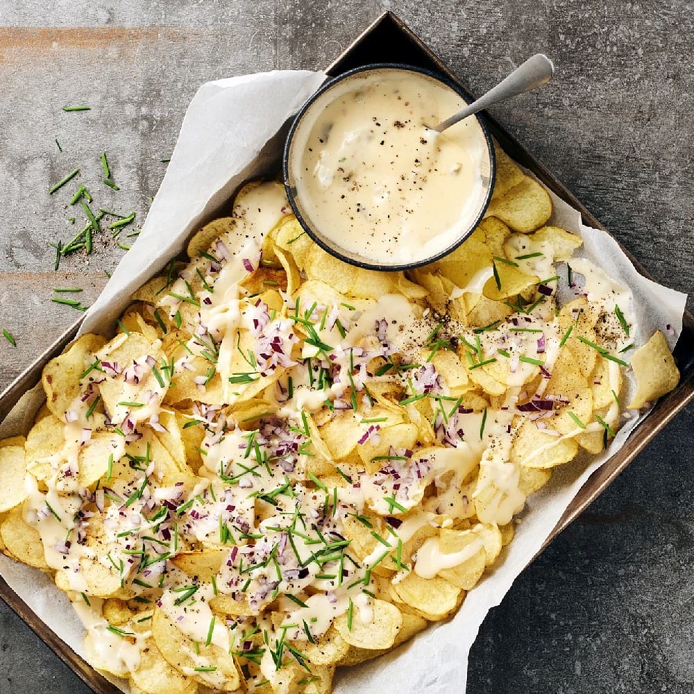 Ostgratinerade guajillochips med pulled chicken och jalapeño