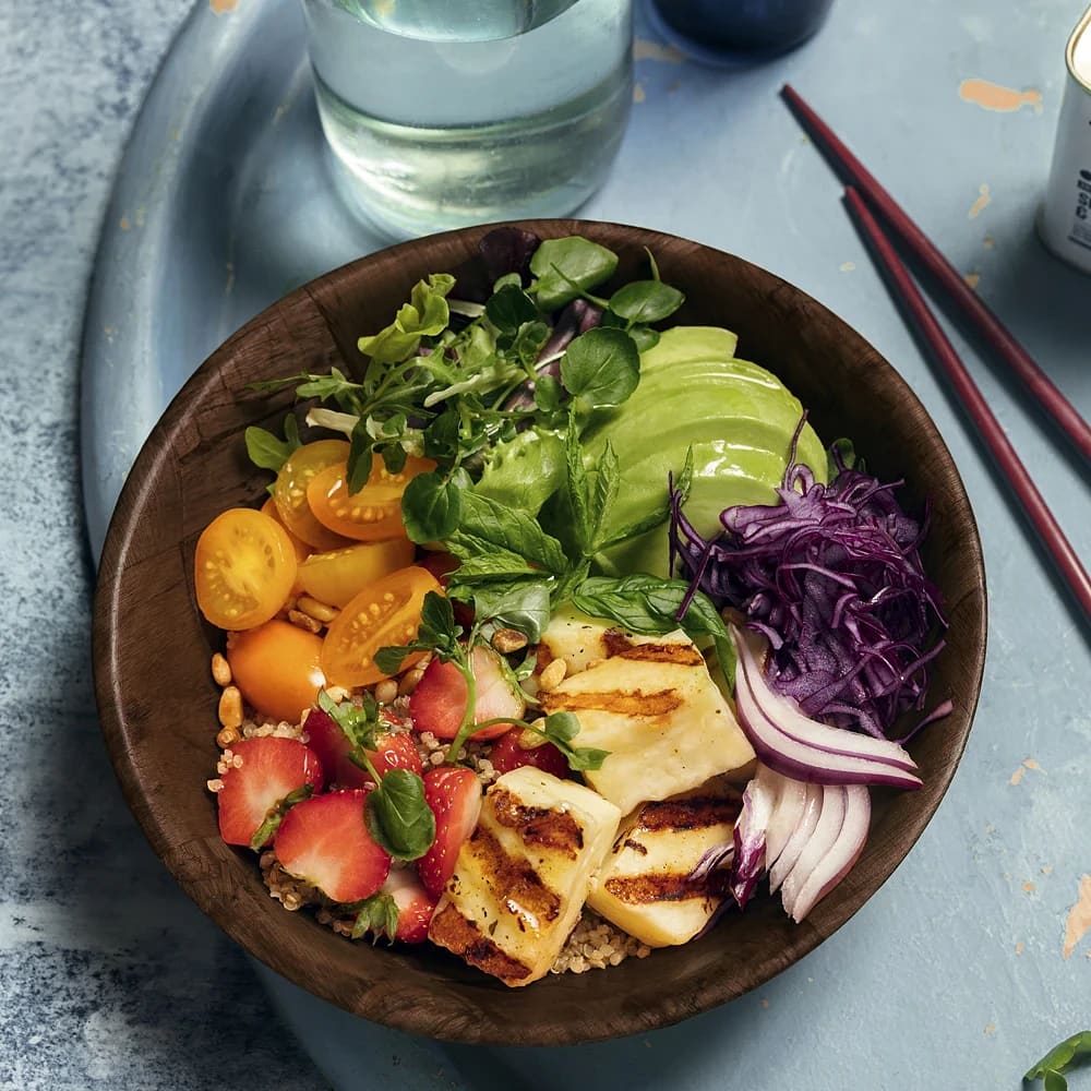 Stekt mozzarella med jordgubbar och basilika i balsamico