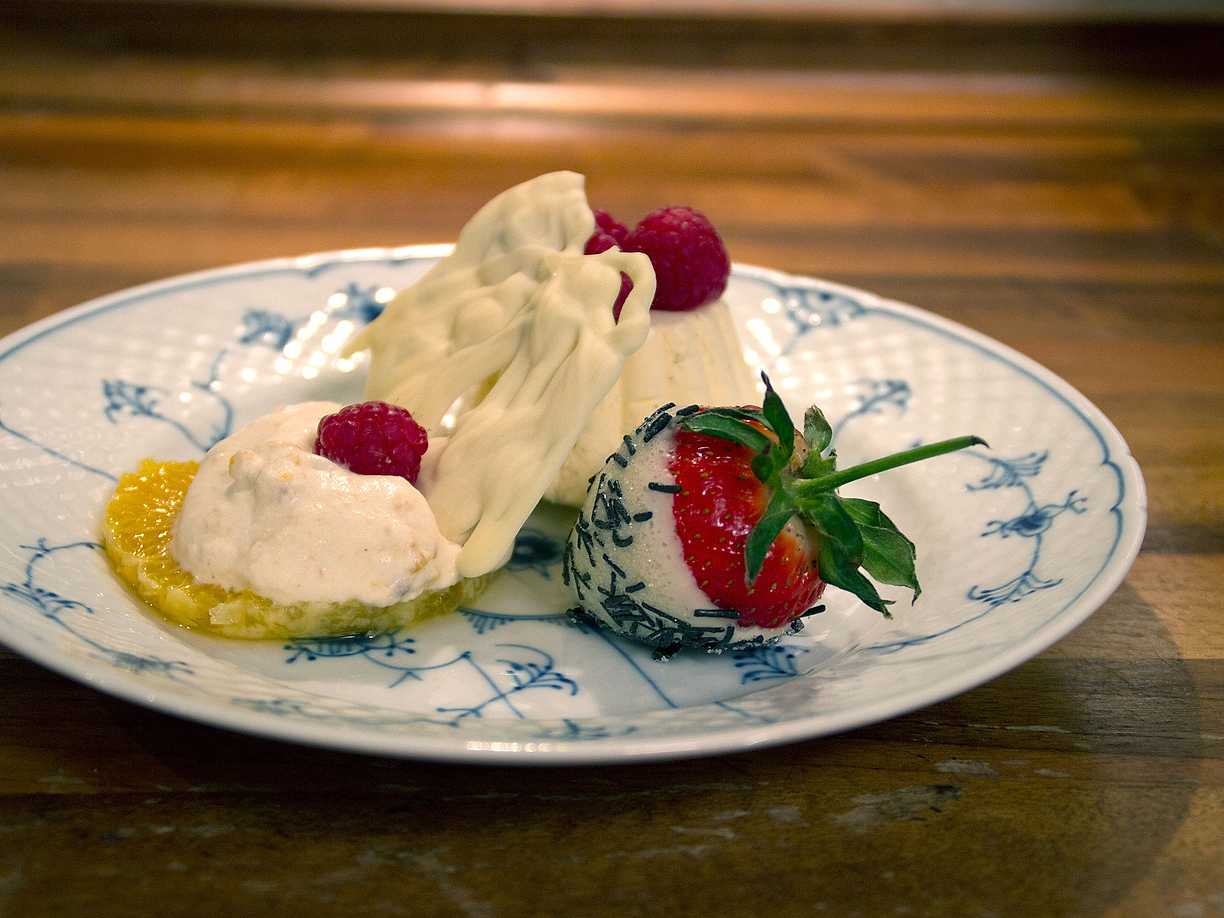 Vit chokladpannacotta med muscovadomarinerade jordgubbar