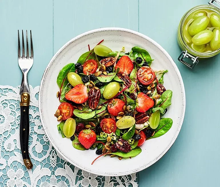 Mangoldsallad med syltade vindruvor, jordgubbar och pekannötter