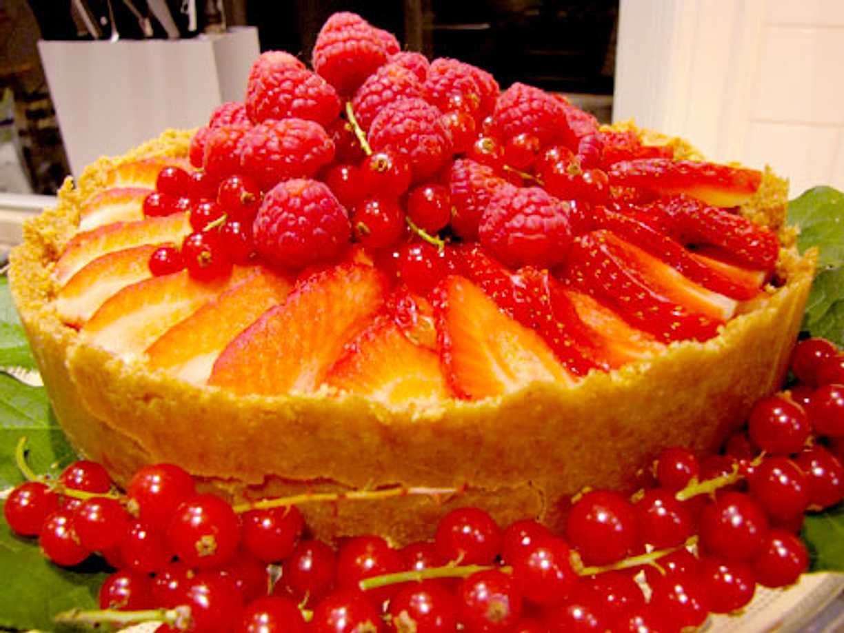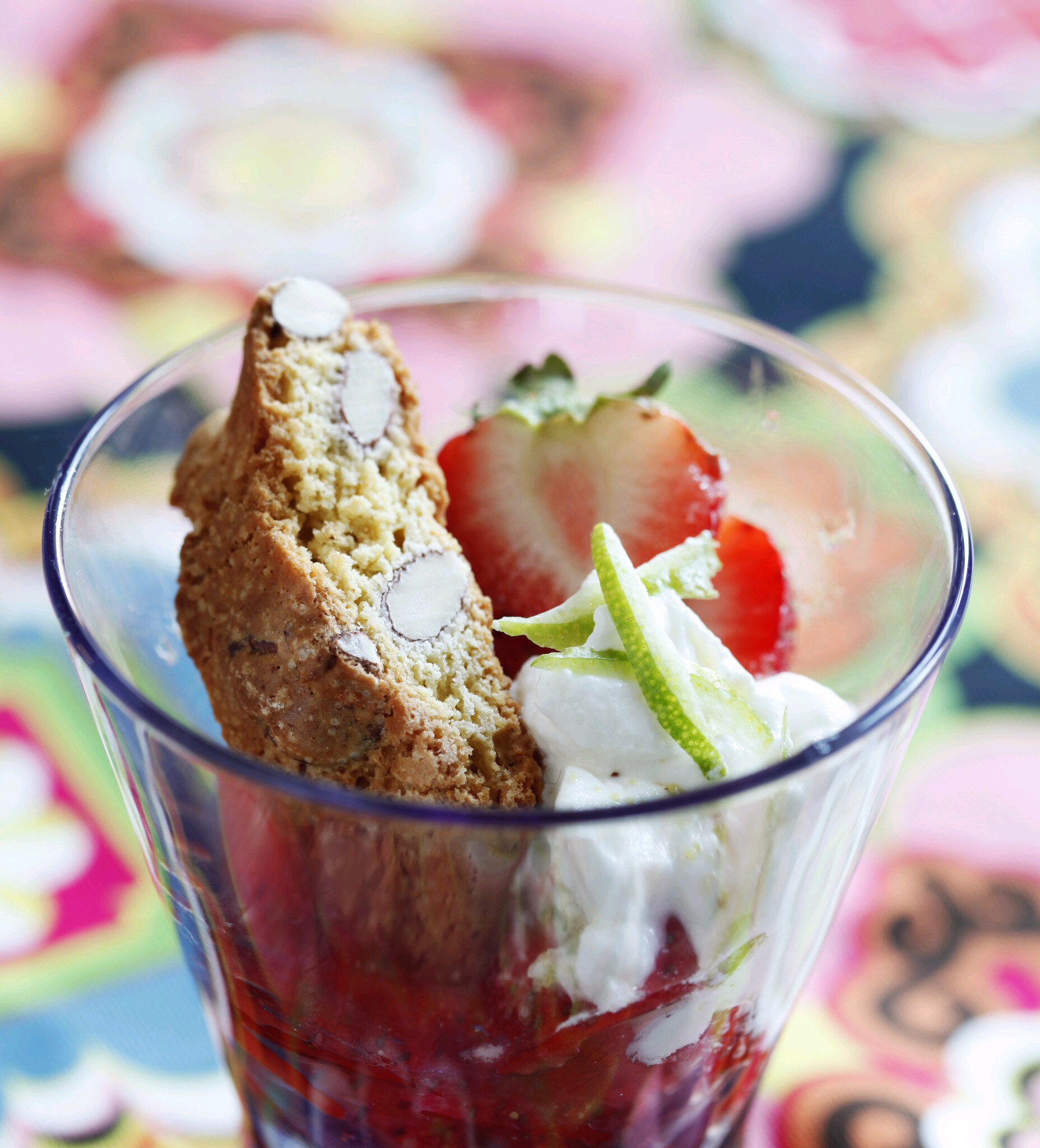 Lätt mandelkaka med äggkräm och limemarinerade jordgubbar