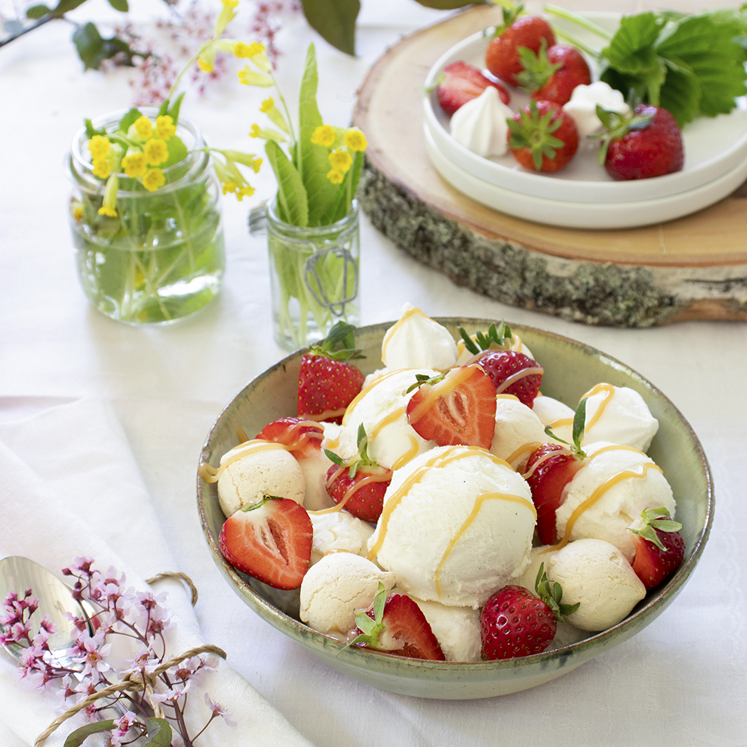 Jordgubbssorbet med limemarinerade jordgubbar och veganska maränger
