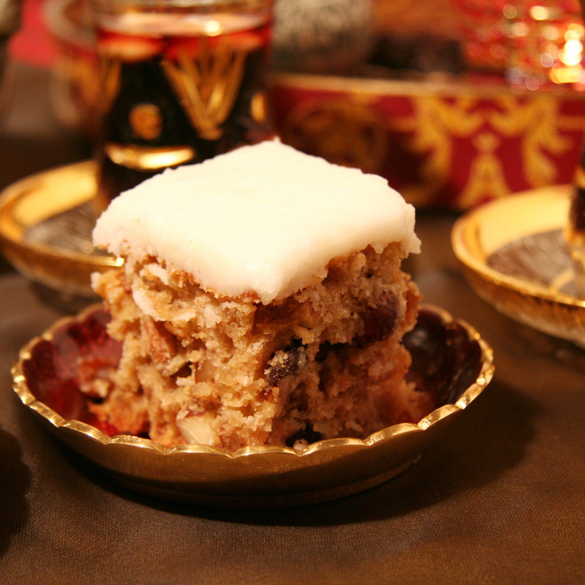 Julig mazarinkaka i långpanna med citrus- och saffransglasyr