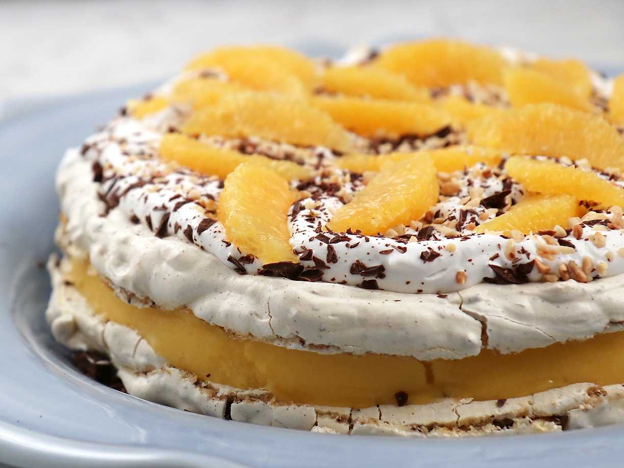 Jultårta med hasselnötsmaräng och mangosorbet