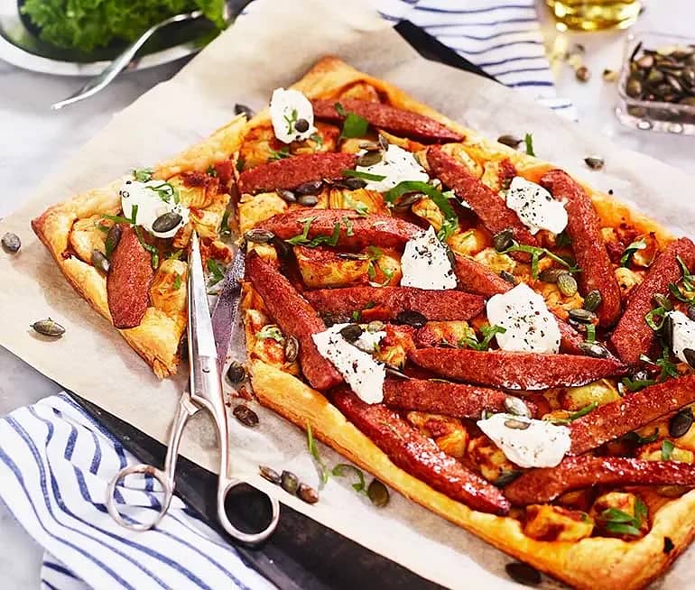 Smördegsflarn med kabanoss, kronärtsskockor, färskost och pumpakärnor