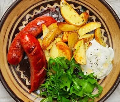 Kyckling i dragonsås med kabanoss och rostad potatis