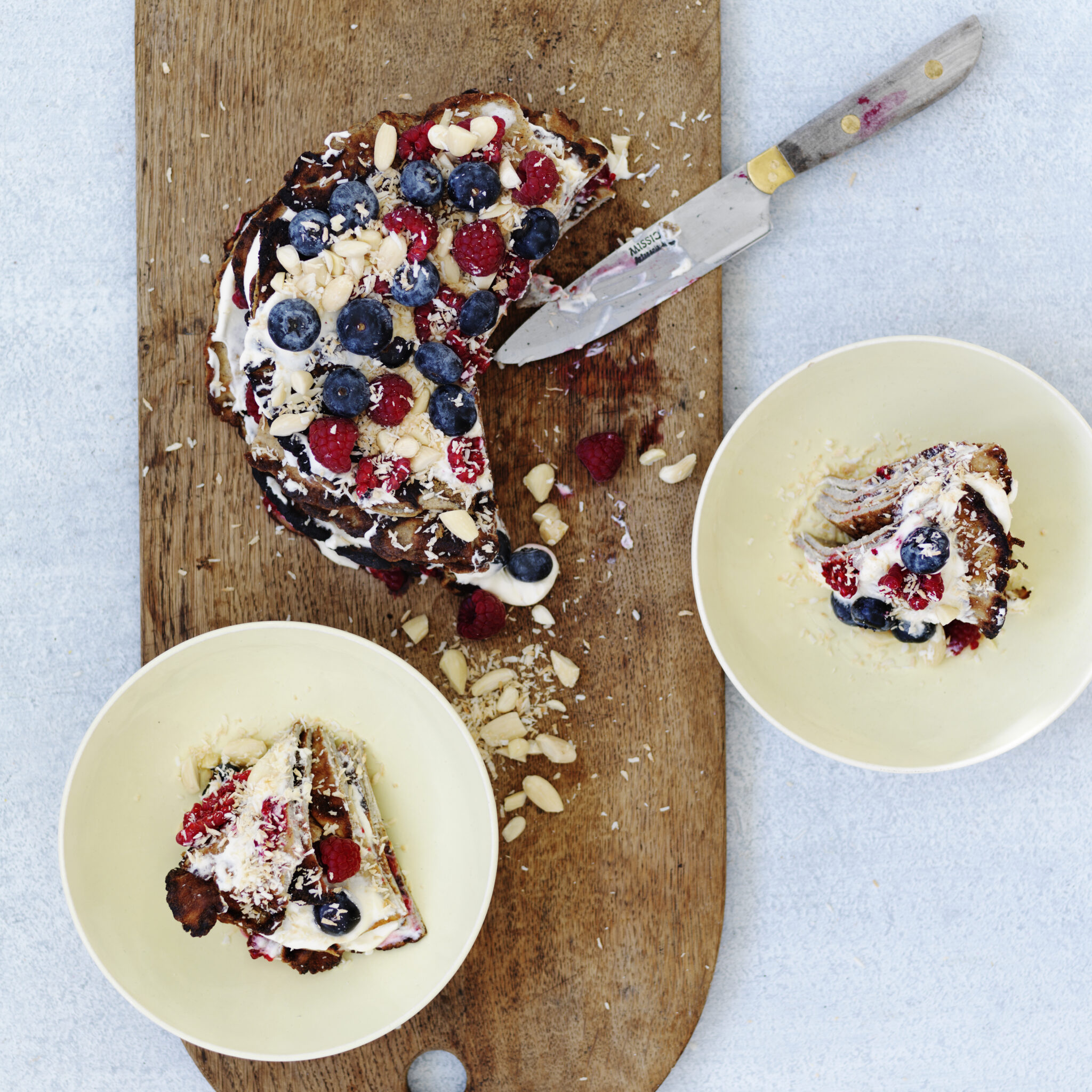 Tårta fylld med brownie, hallonmousse och chokladcheesecake