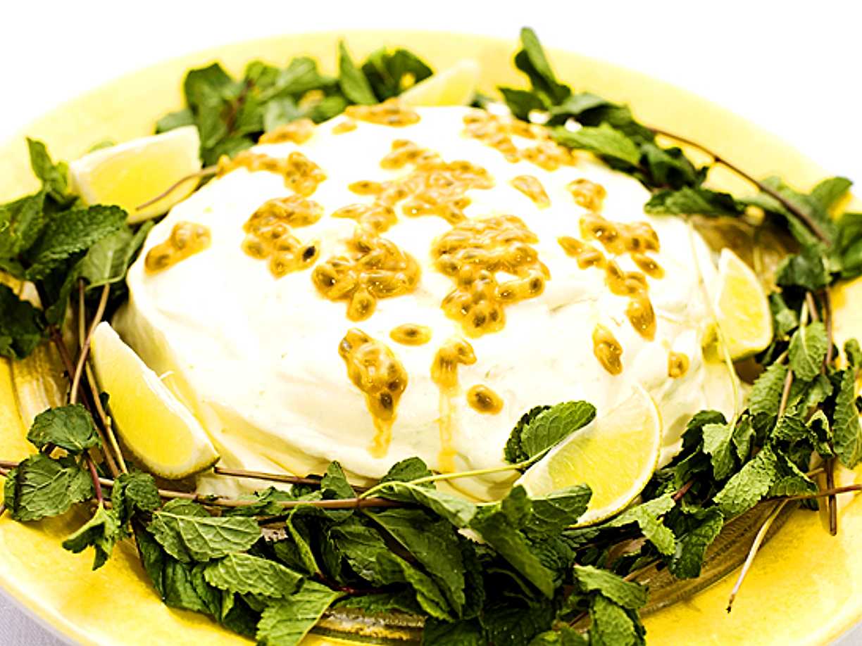 Vit chokladcheesecake med blodapelsinsås och marängtoppar