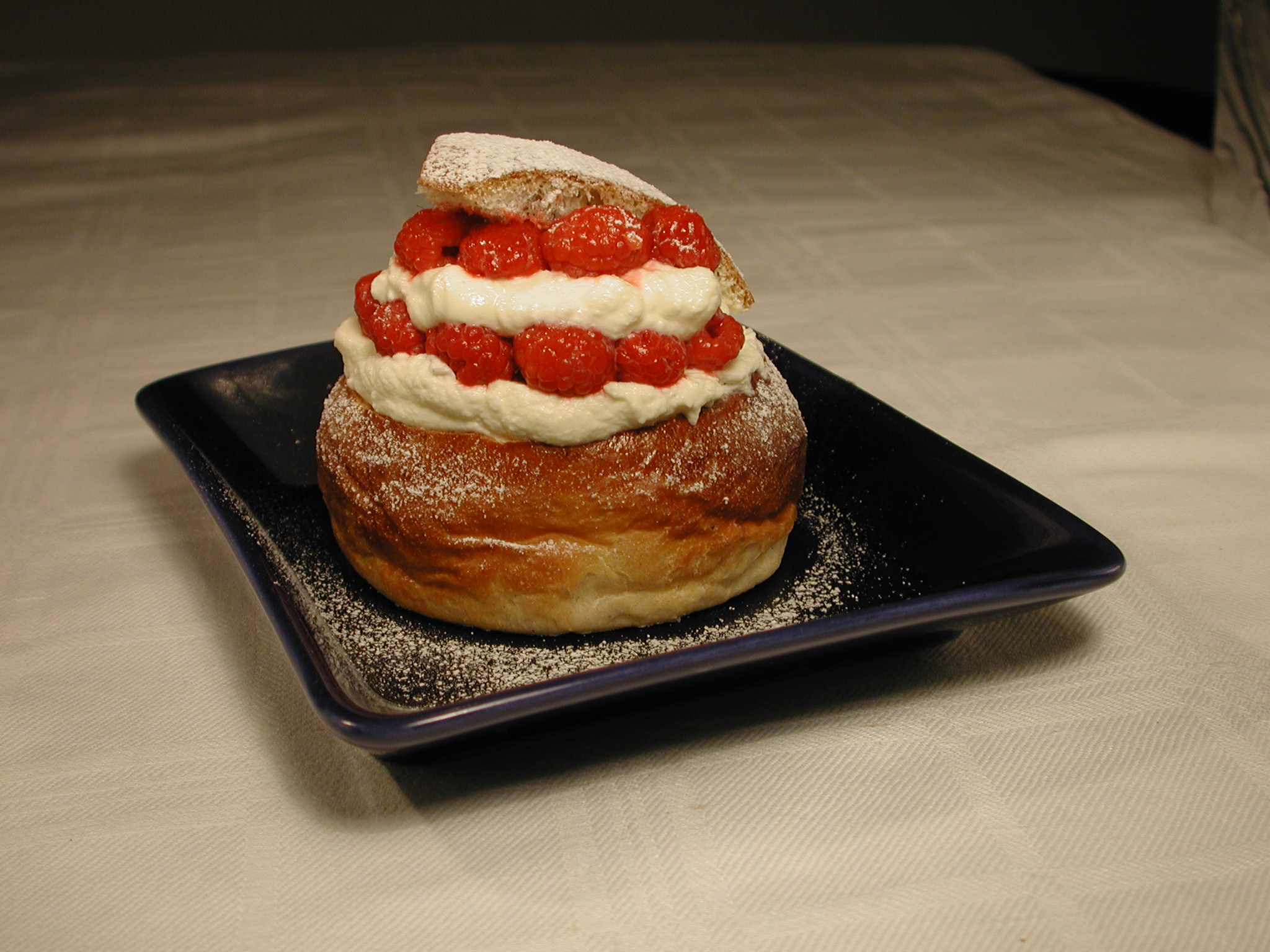 Chokladfudgetårta med hallon och lättvispad grädde