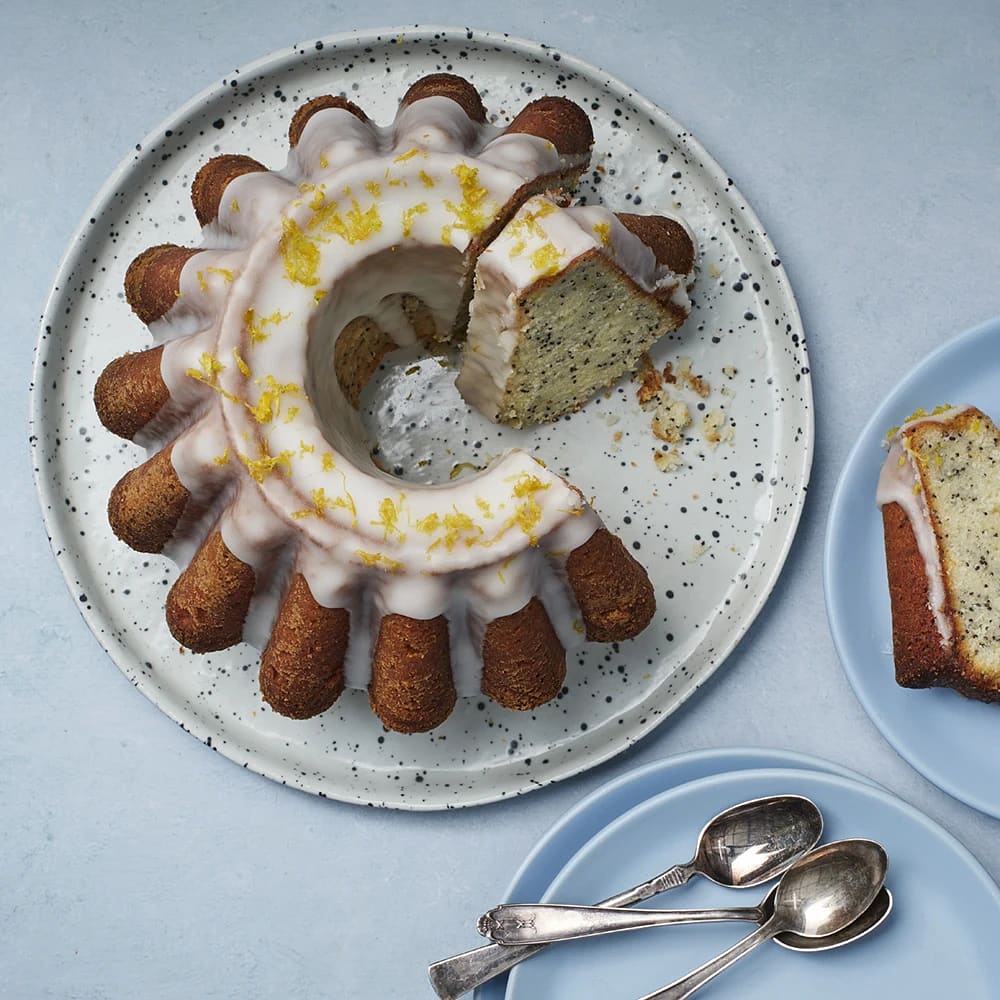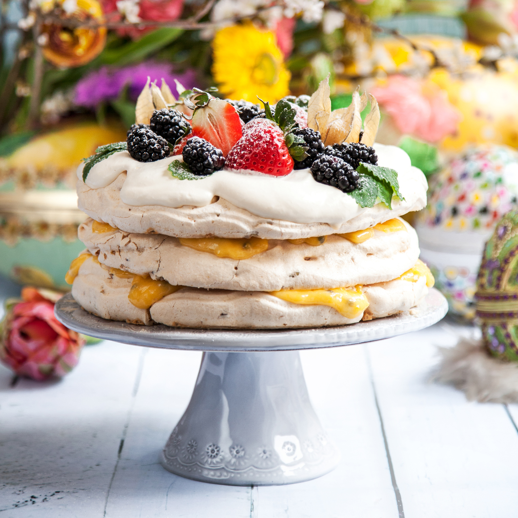 Pistagemarängtårta med citron-och passionsfruktscurd