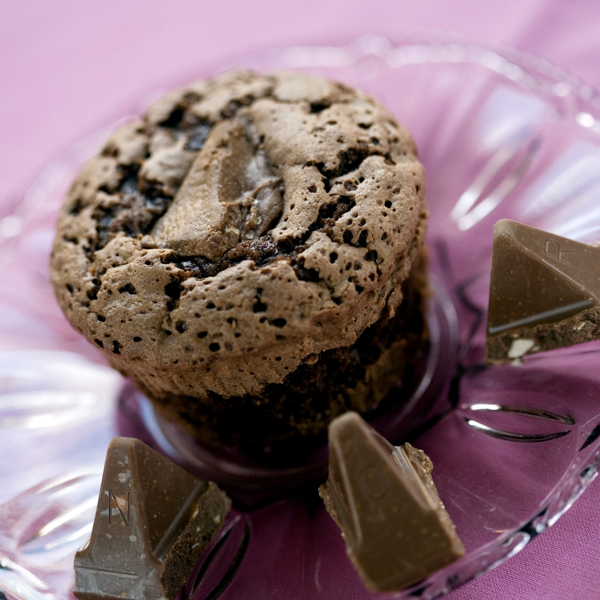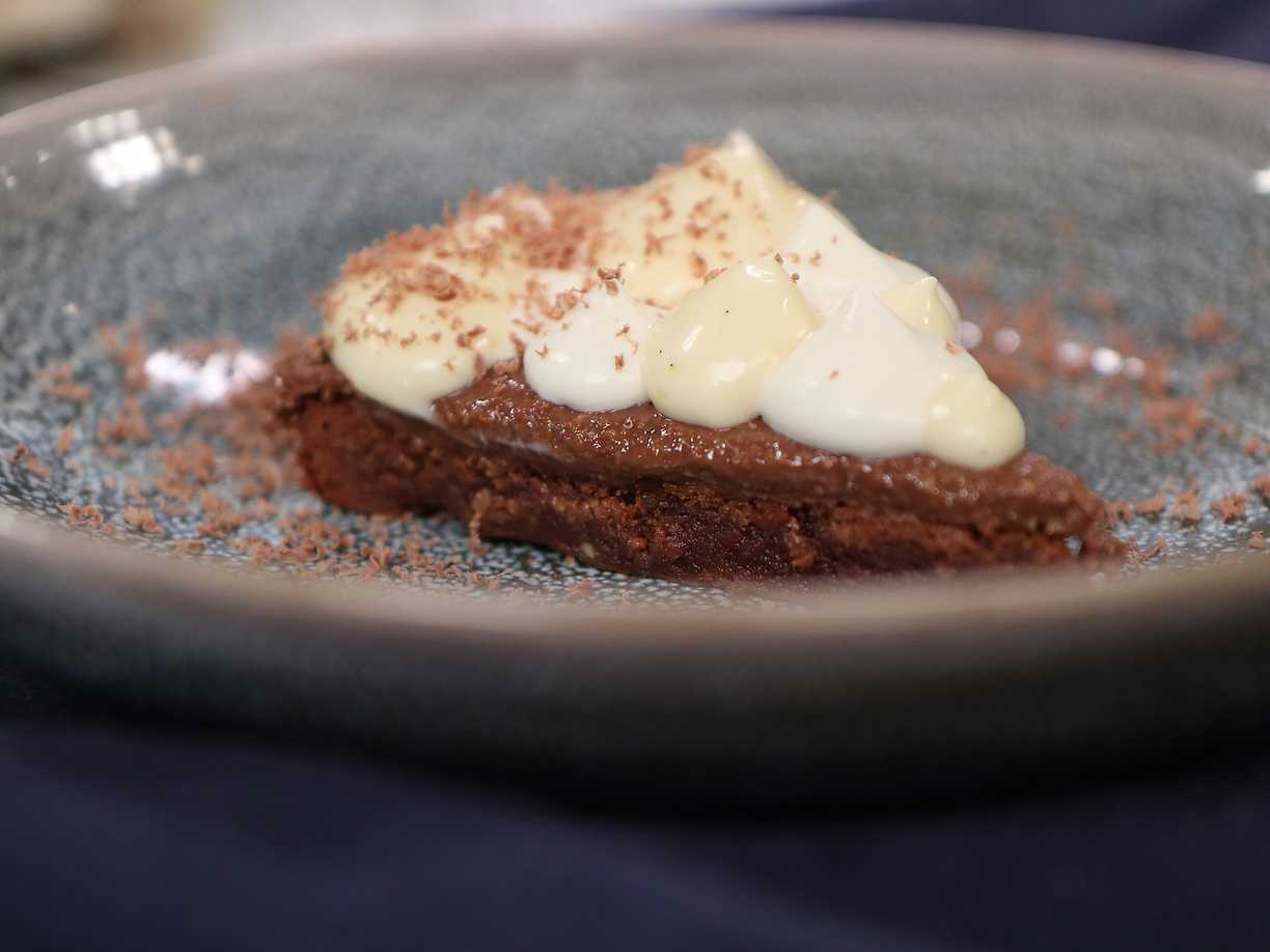 Mjölkchokladbrownie med gianduja och apelsinpannacotta
