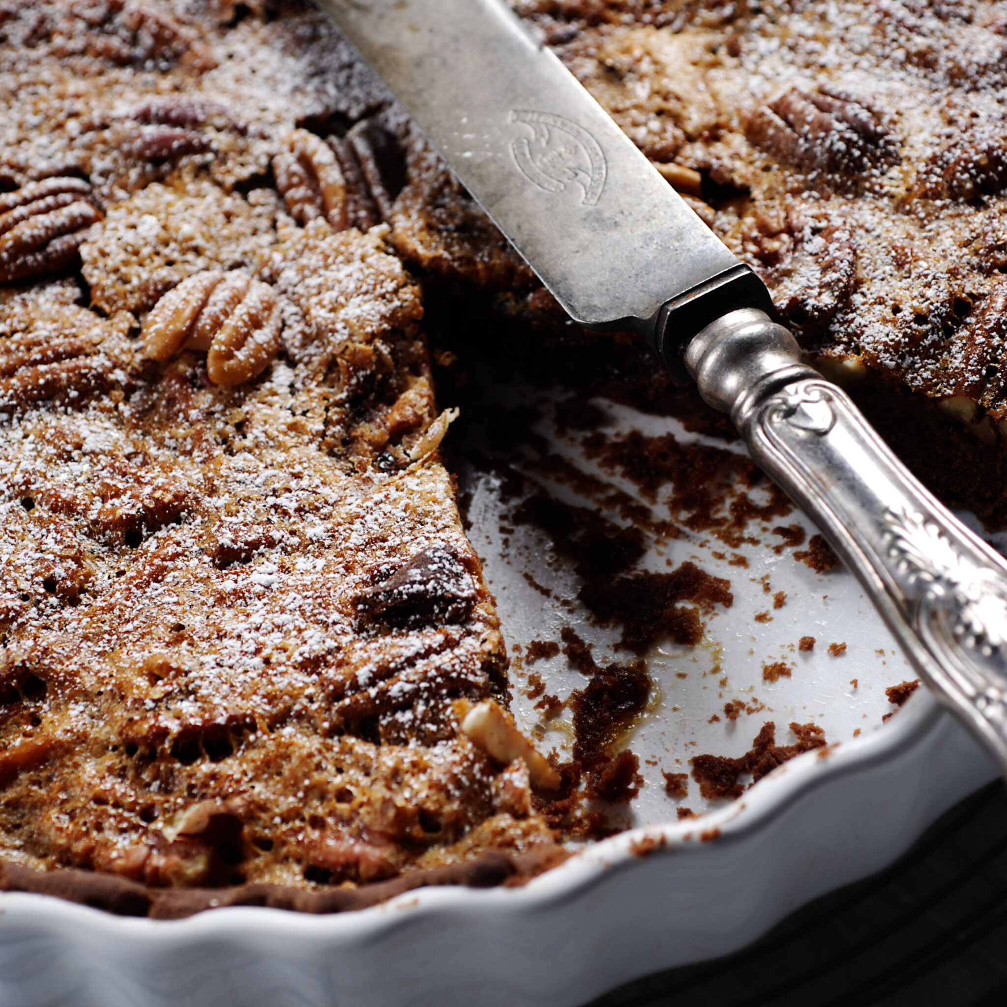 Kardemummadoftande äppelkaka med pekannötskolasås, vaniljglass och rostade pekannötter