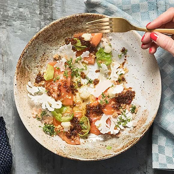Smörbakad rotselleri med rostad mandel, tryffel, kål och rökt ren