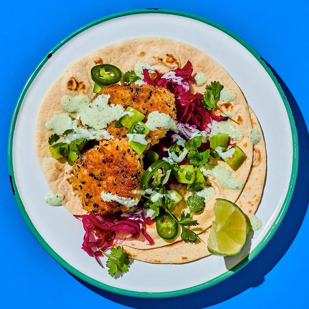 Fish tacos med jalapeño, korianderyoghurt och syrad kål
