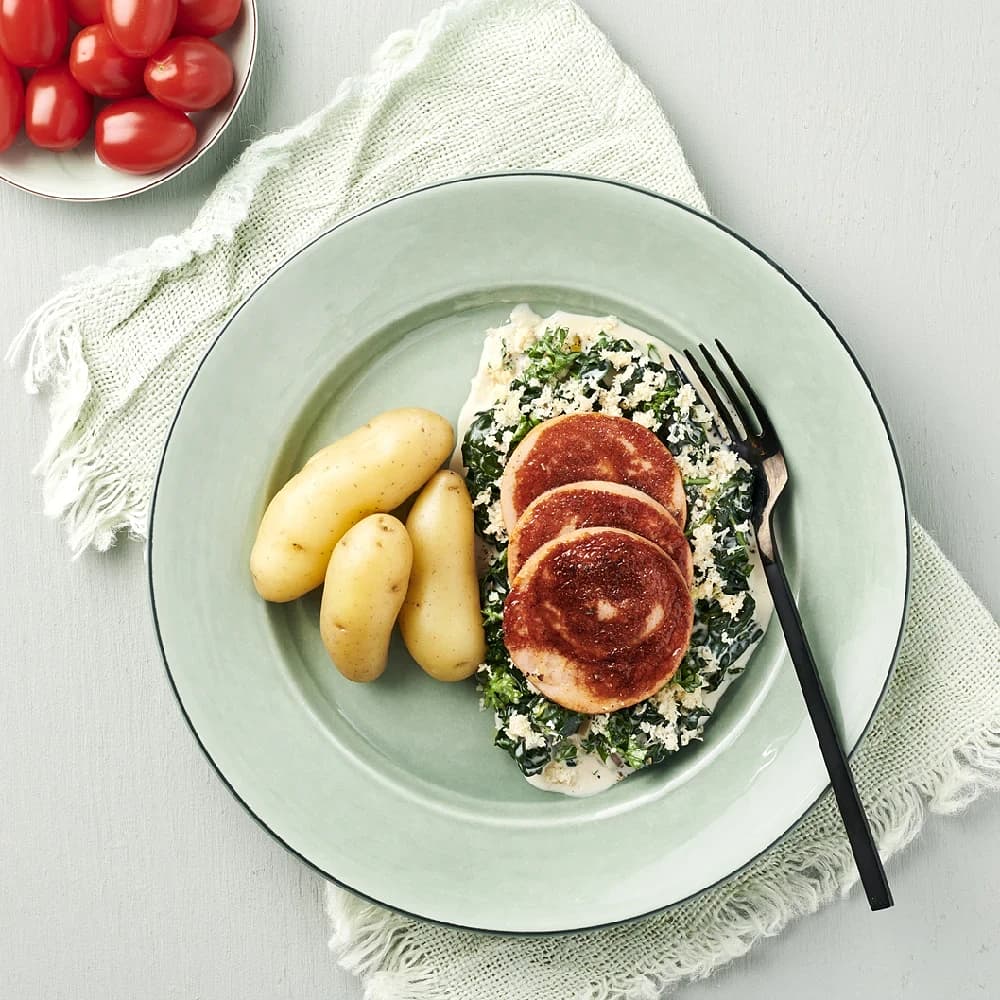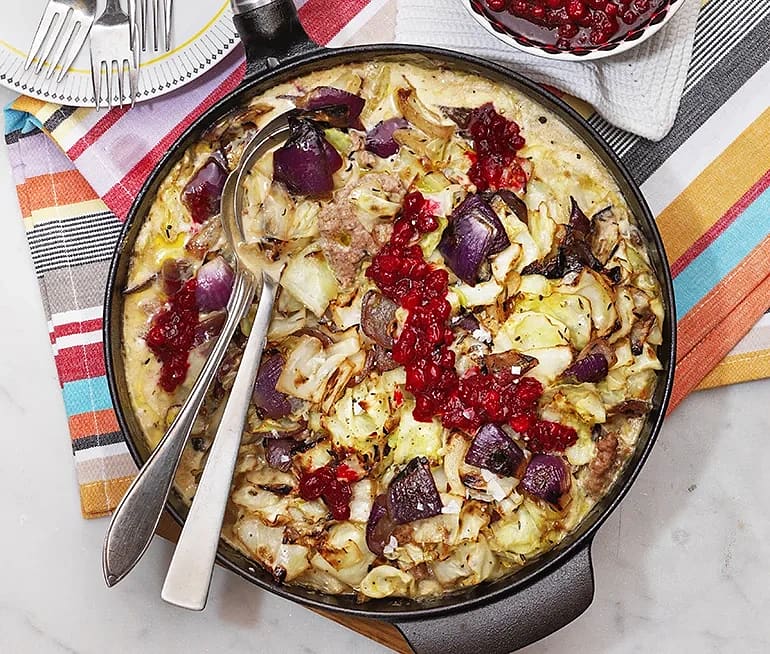 Fläskkotlett med gräddkokt brynt kål och lingon