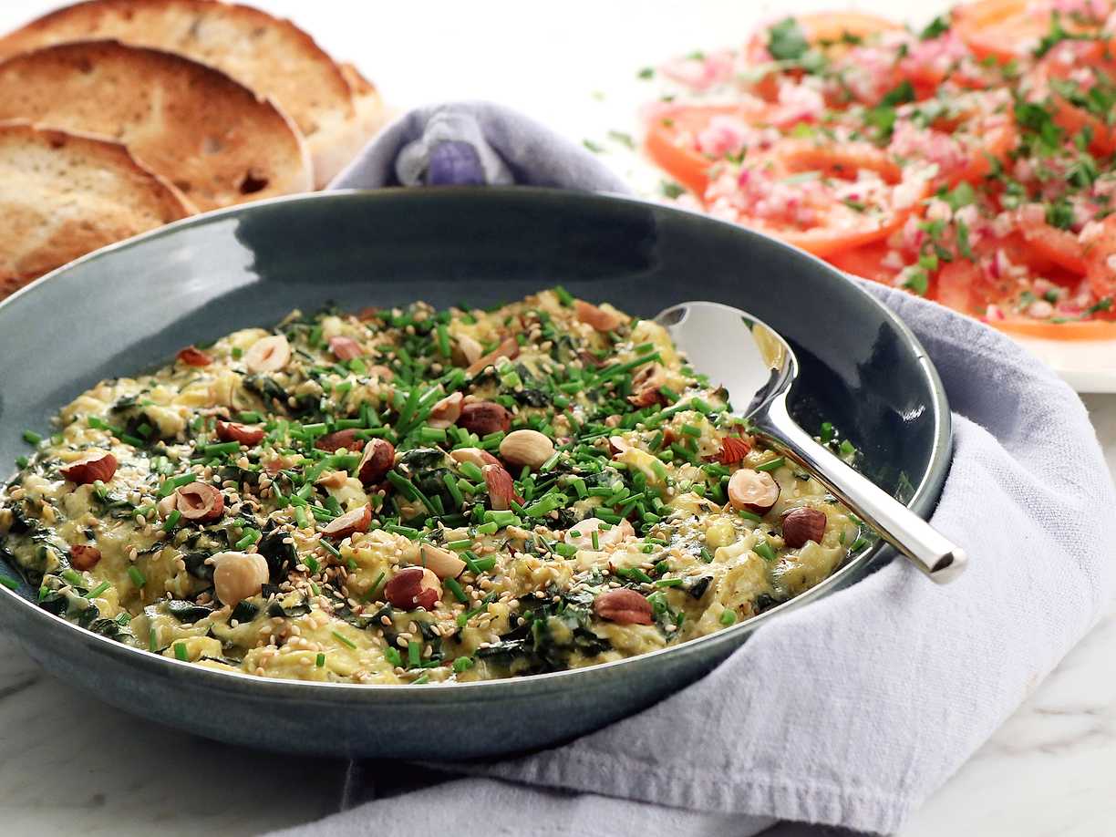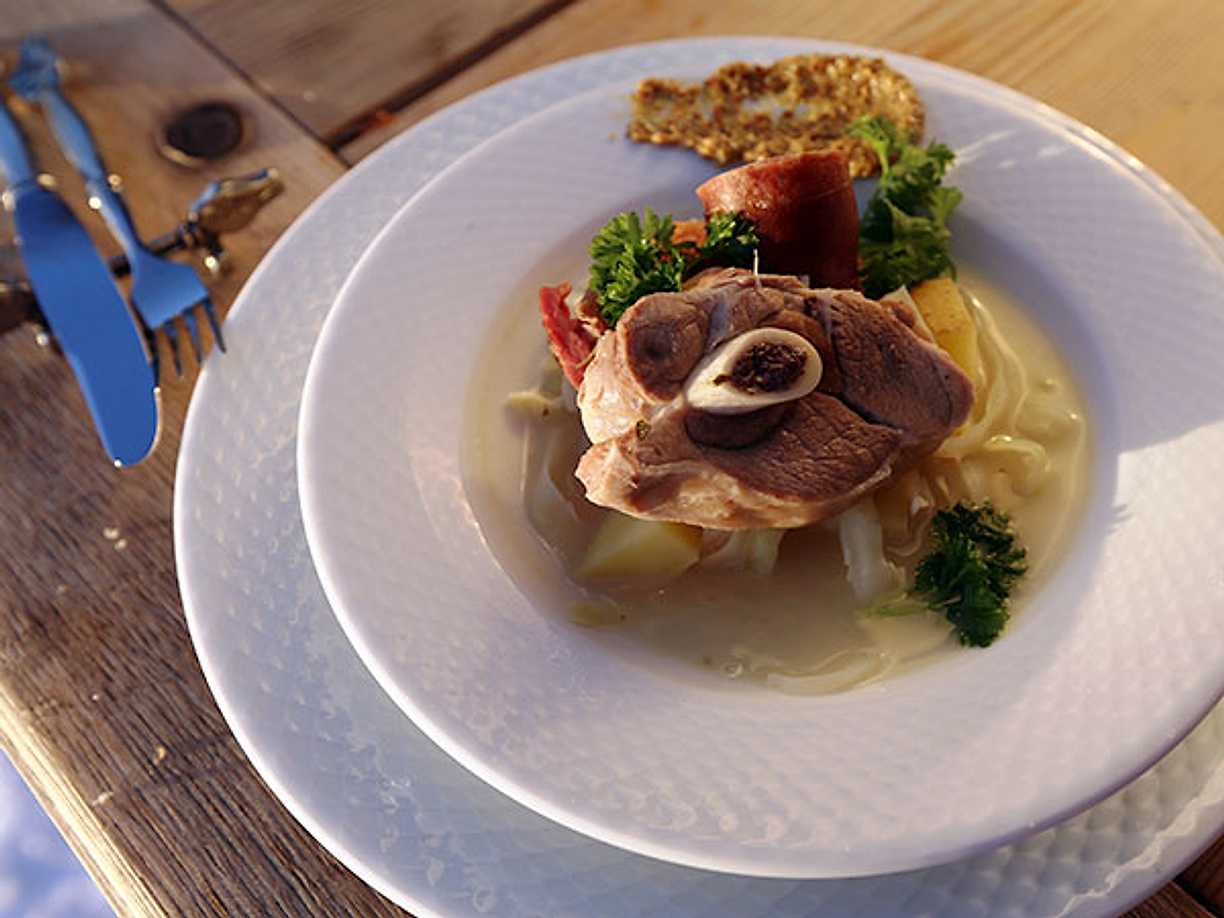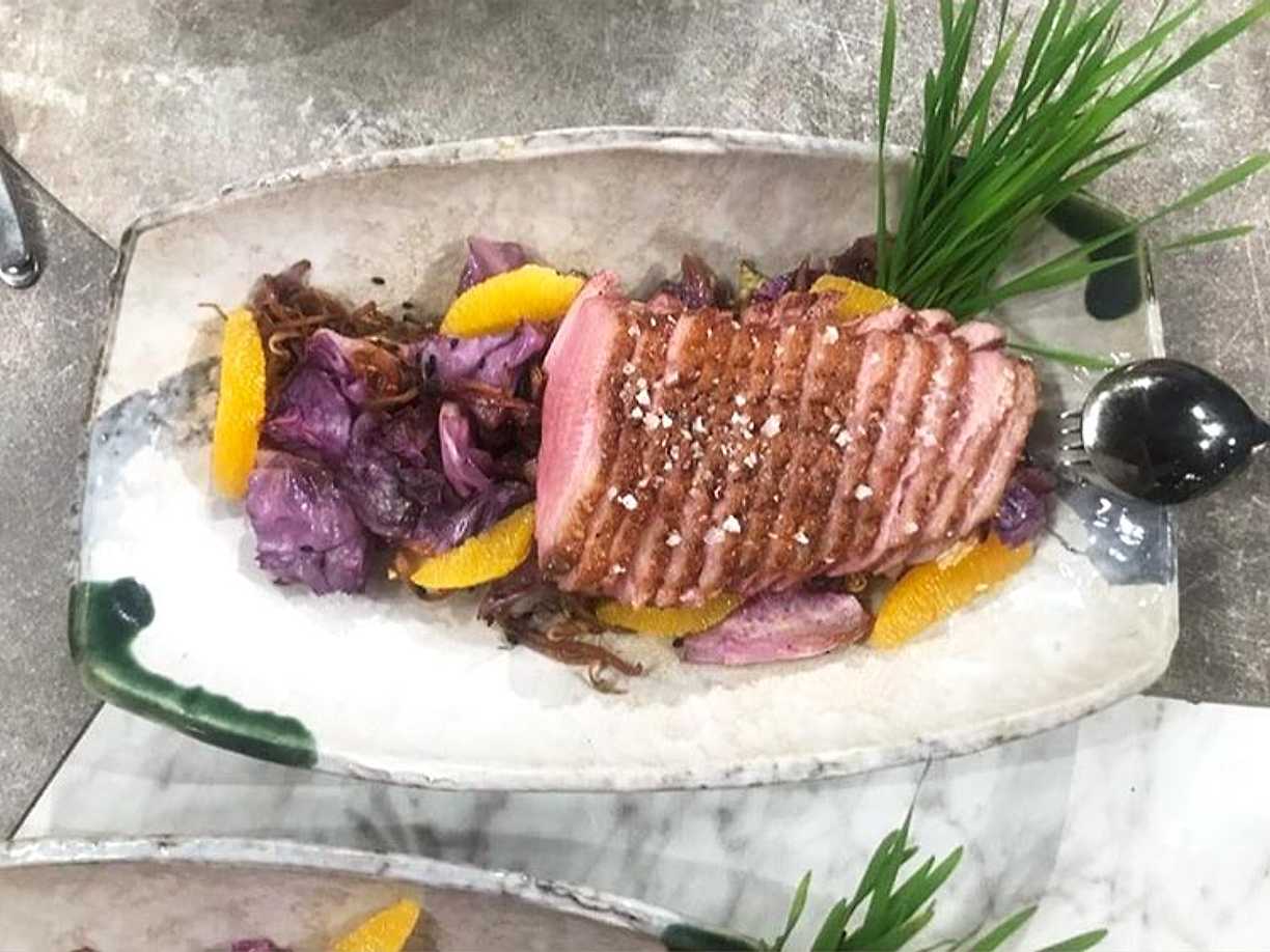 Bakad rotselleri med örtsmör, gräddkokt kål med tryffel, rostad mandel och knaperstekt fläsk