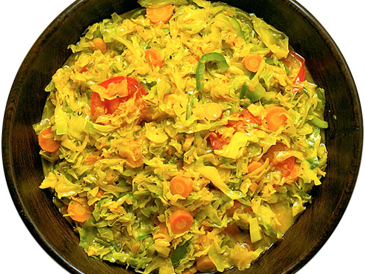 Solgul currygryta med sötpotatis, kål och kikärtor