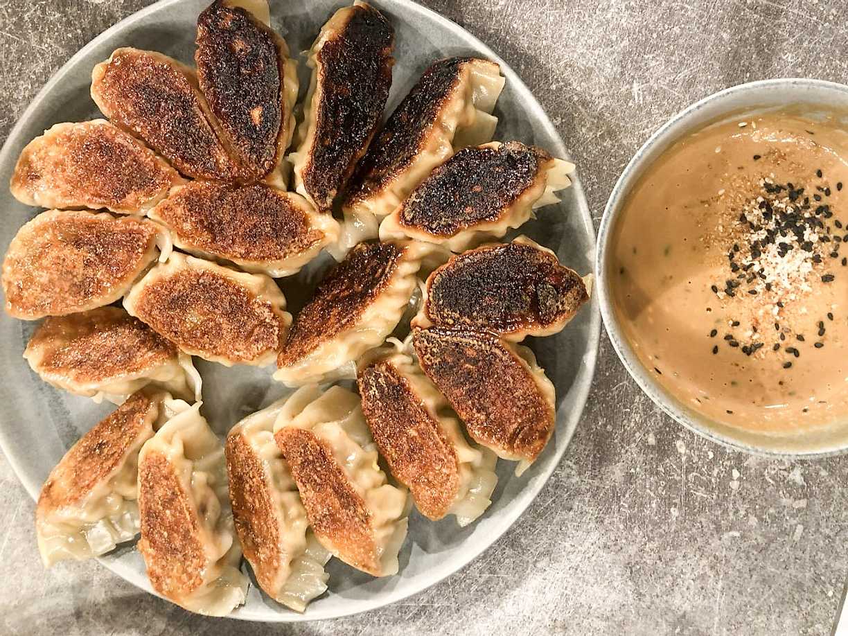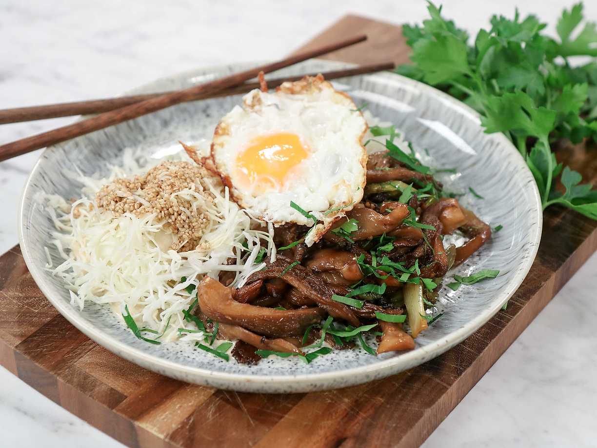 Svampkroketter med syrad lök, kål och sojamajonnäs