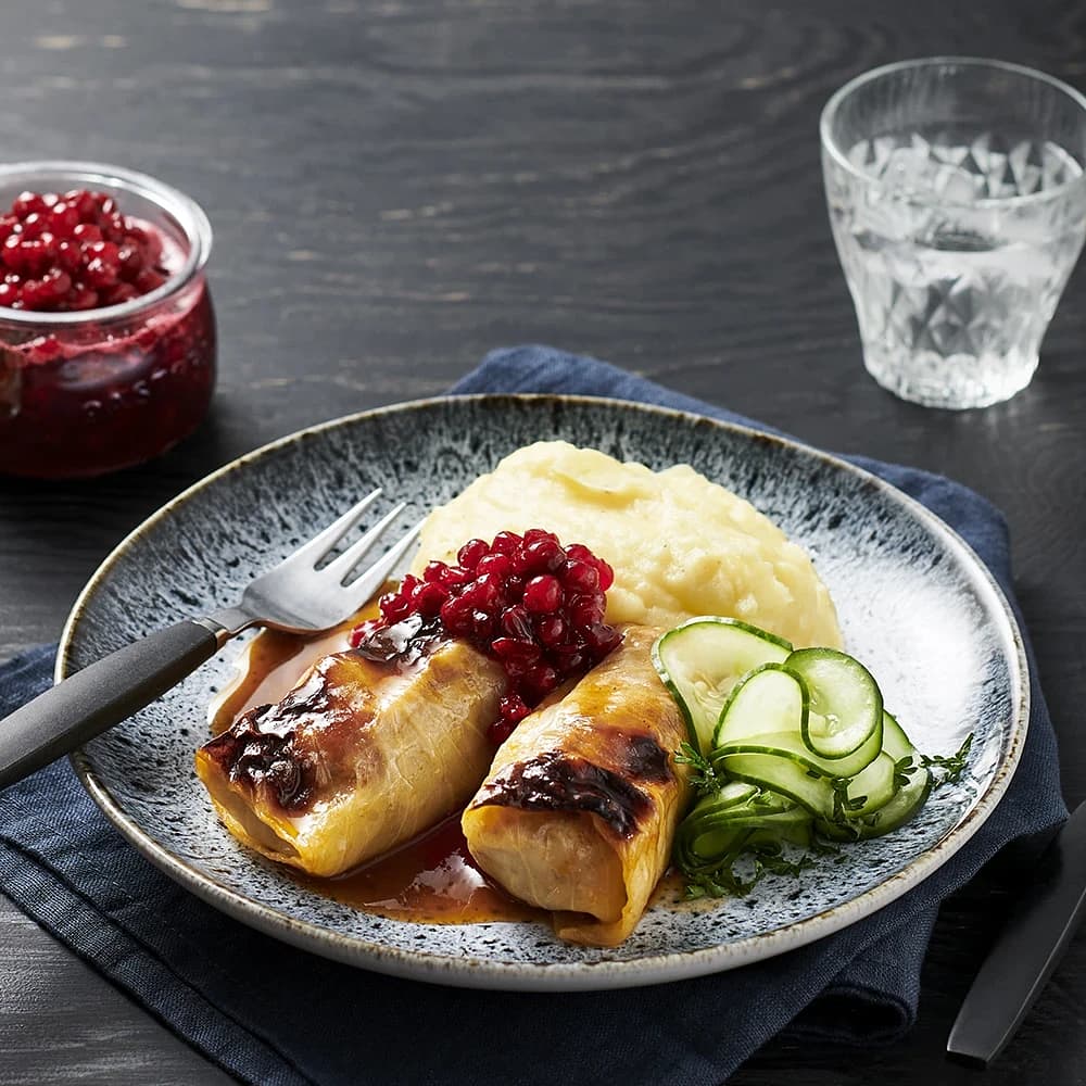 Kåldolmar med potatismos och rårörda lingon