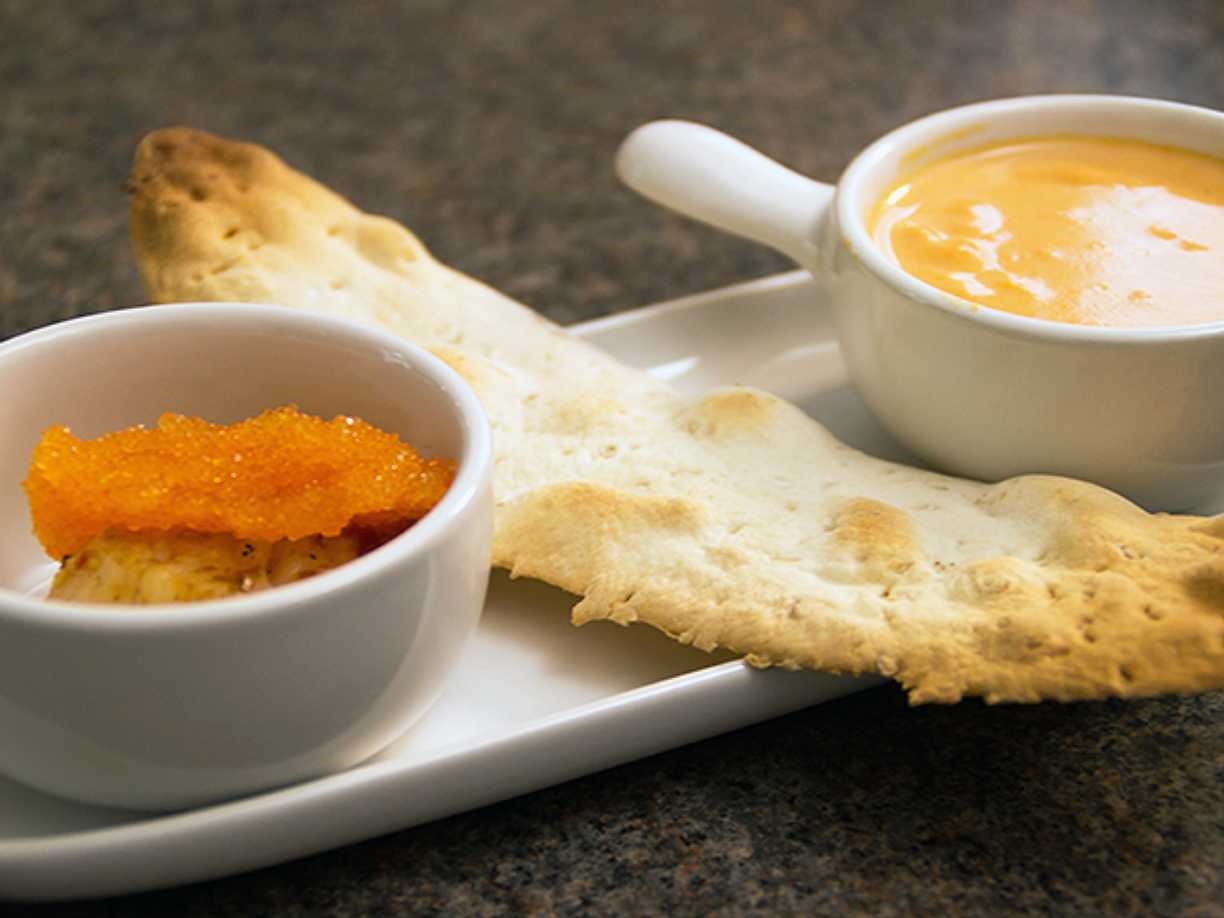 Hummersoppa med halstrad pilgrimsmussla och Kalixlöjrom