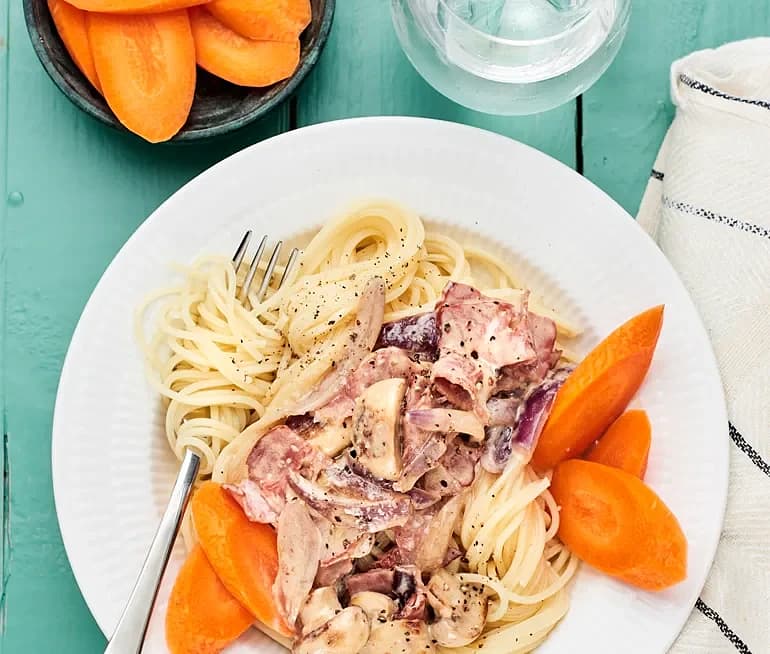 Pasta med kalkonbacon, jordärtskocka och parmesan