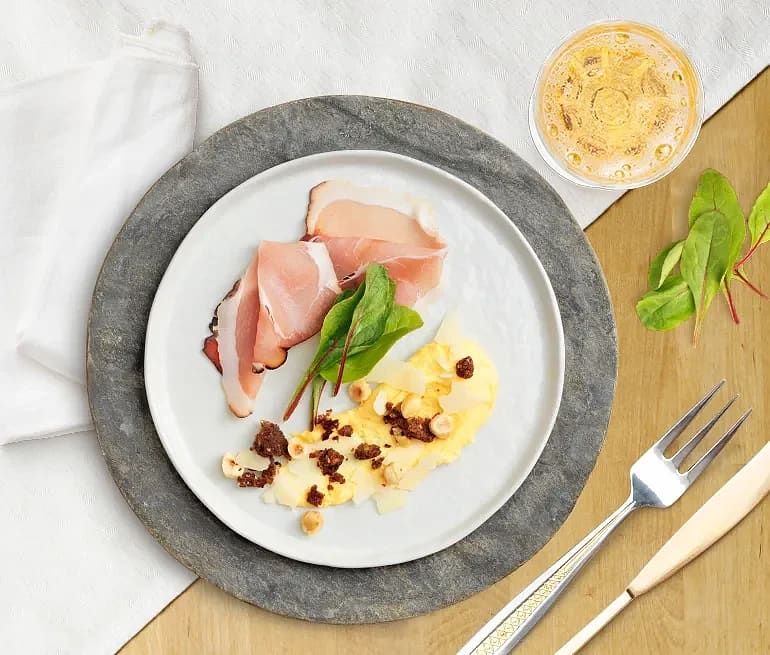 Pumpacrème med hyvlad parmesan och kallrökt skinka