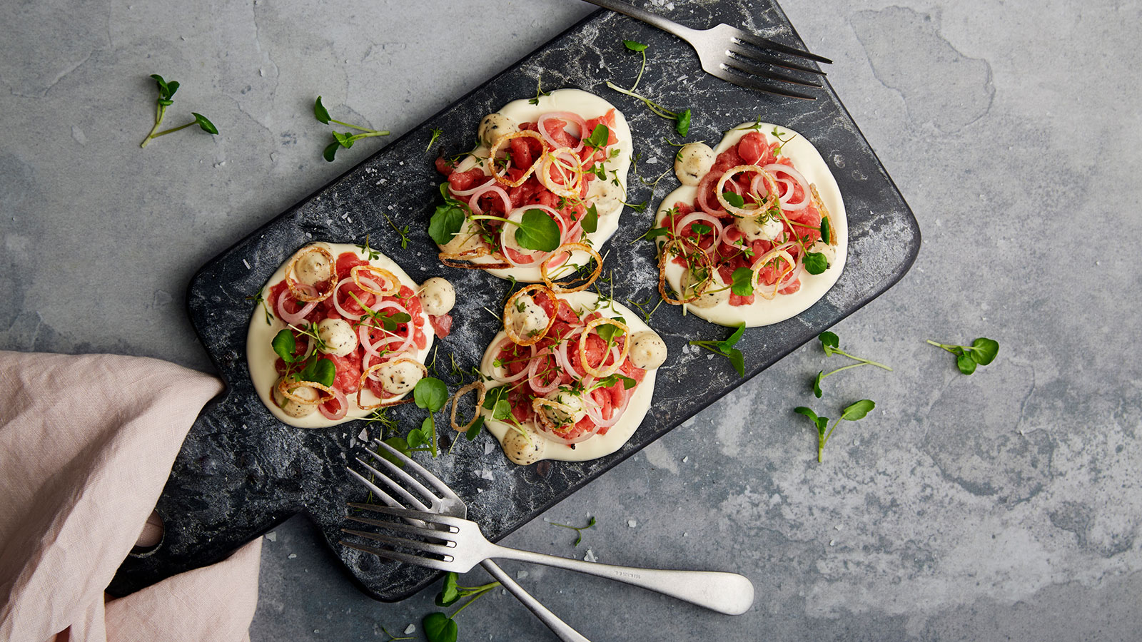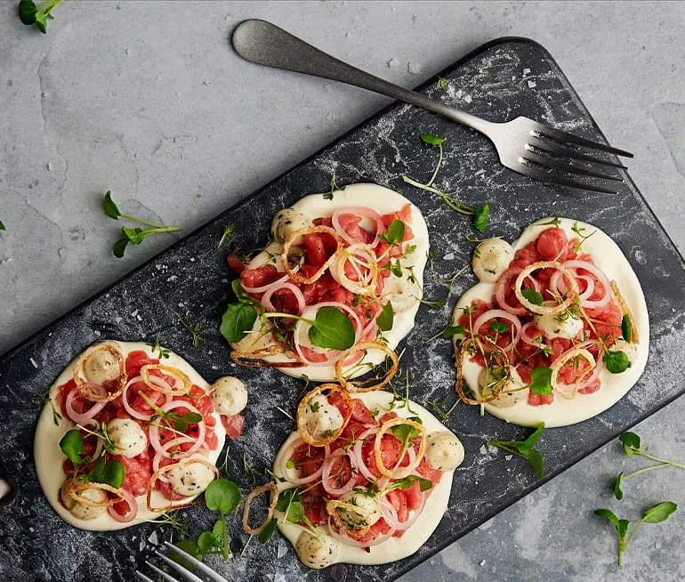 Kalvtartar med Tellicherrymayo och schalottenlök