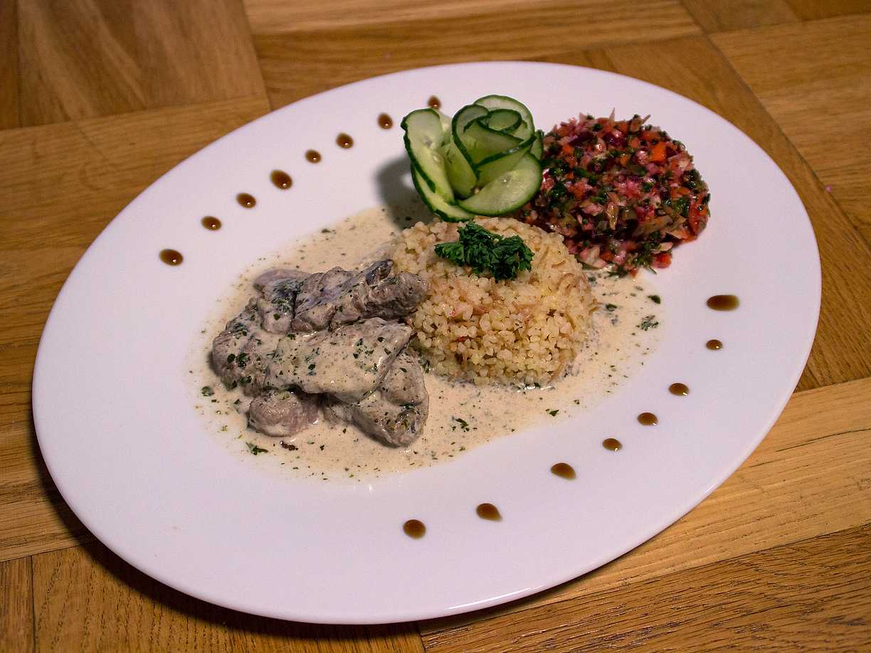 Kalv i svampsås, serveras med bulgur