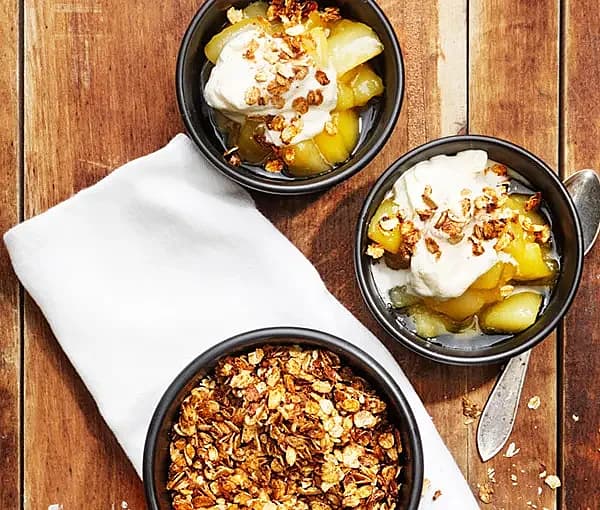 Kanel- och honungsrostad havre och nötter med yoghurt och äpple