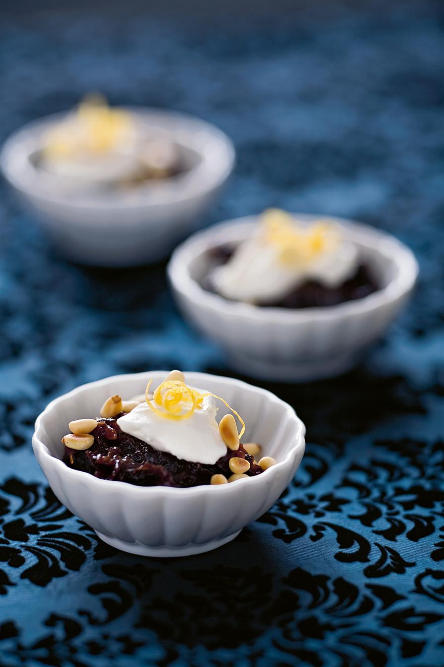 Svarta vinbärstårta med rosmarin, kardemumma- och mandelbottnar samt italiensk maräng