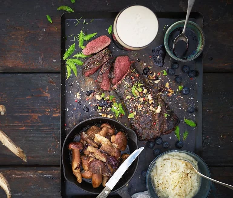 Gran- och enbärsmarinerad renfilé med Karl-Johansvamp, blåbärssås & selleripuré