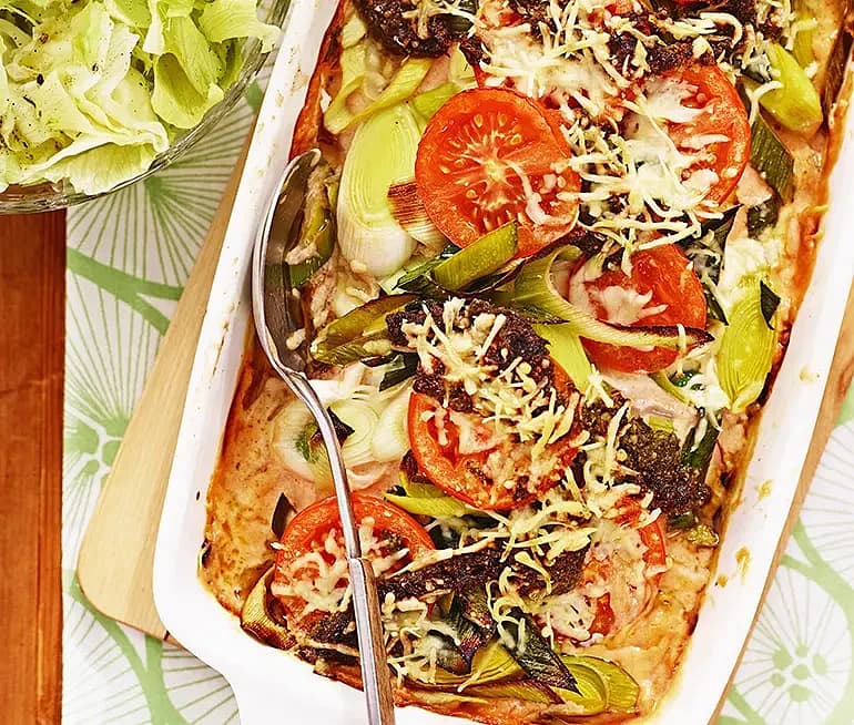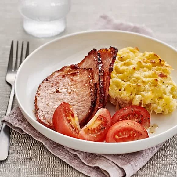 Ostgratinerad kassler och tomatsallad