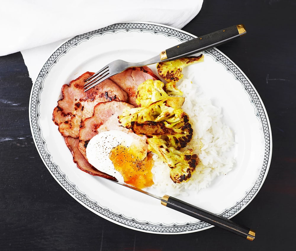 Bräckt kassler med currystekt blomkål