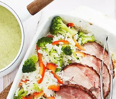 Kassler med broccoli och grönsaksris