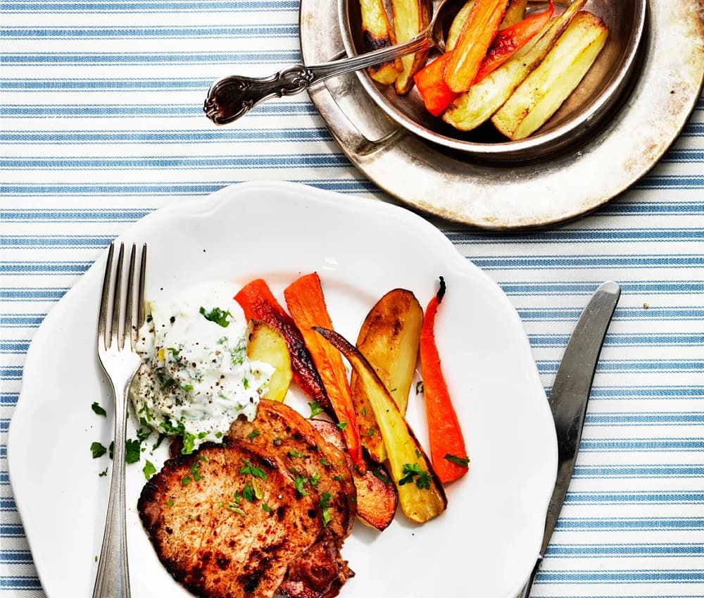 Stekt kassler med gräslöksstuvade morötter