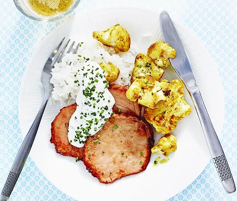 Kassler med currystekt blomkål och gräslöksyoghurt