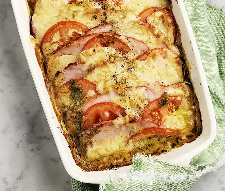 Pestogratinerad kassler med tomat