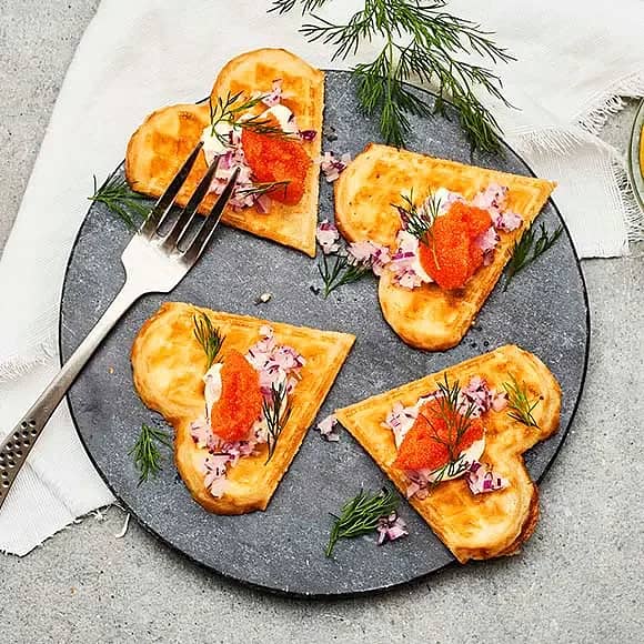 Vörtvåffla med gravad lax, pepparrotskräm, rödlök och kaviar