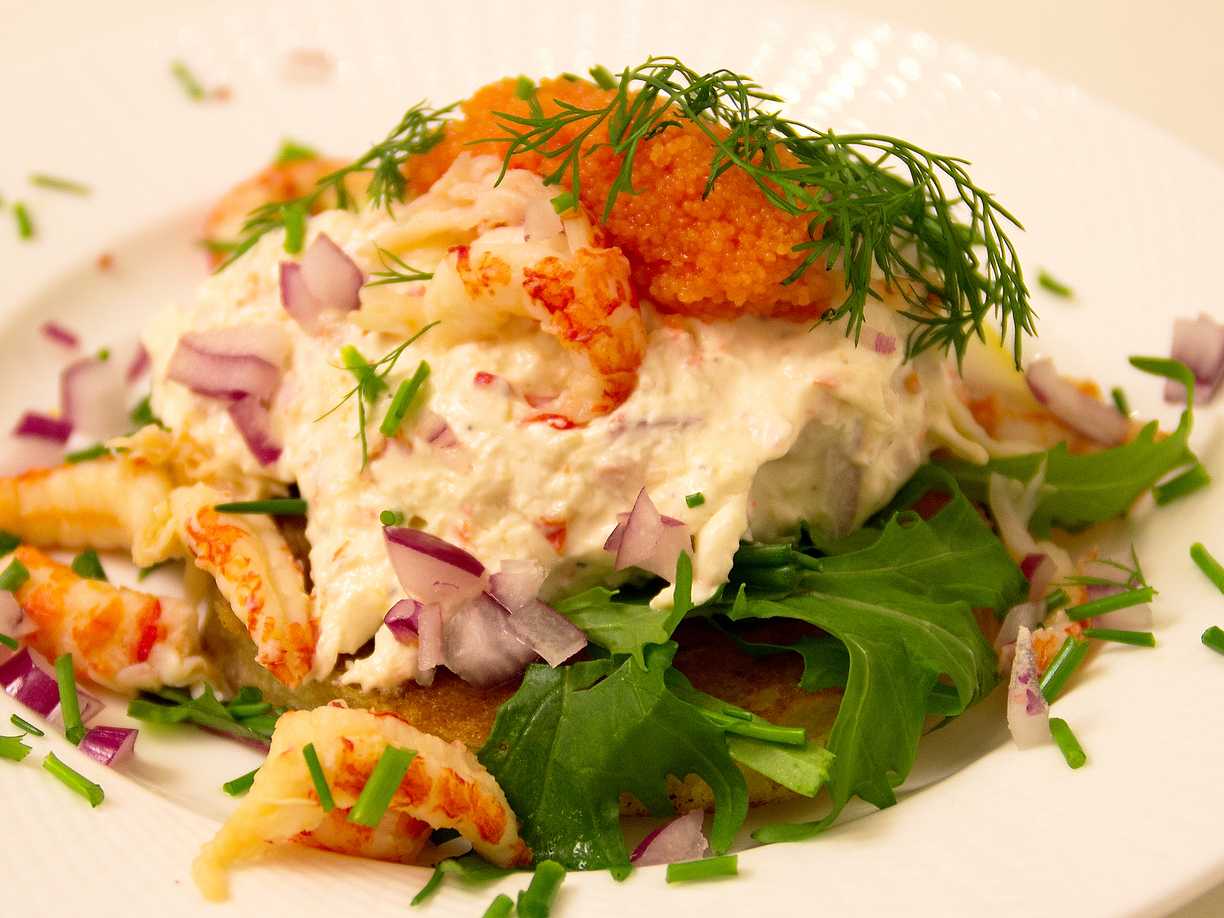 Evas ostkroksbakelse med färska räkor och svart kaviar