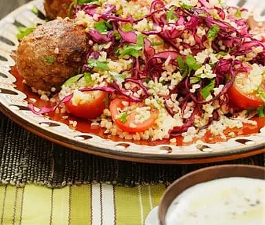 Kebab med krispig rödkålsbulgur