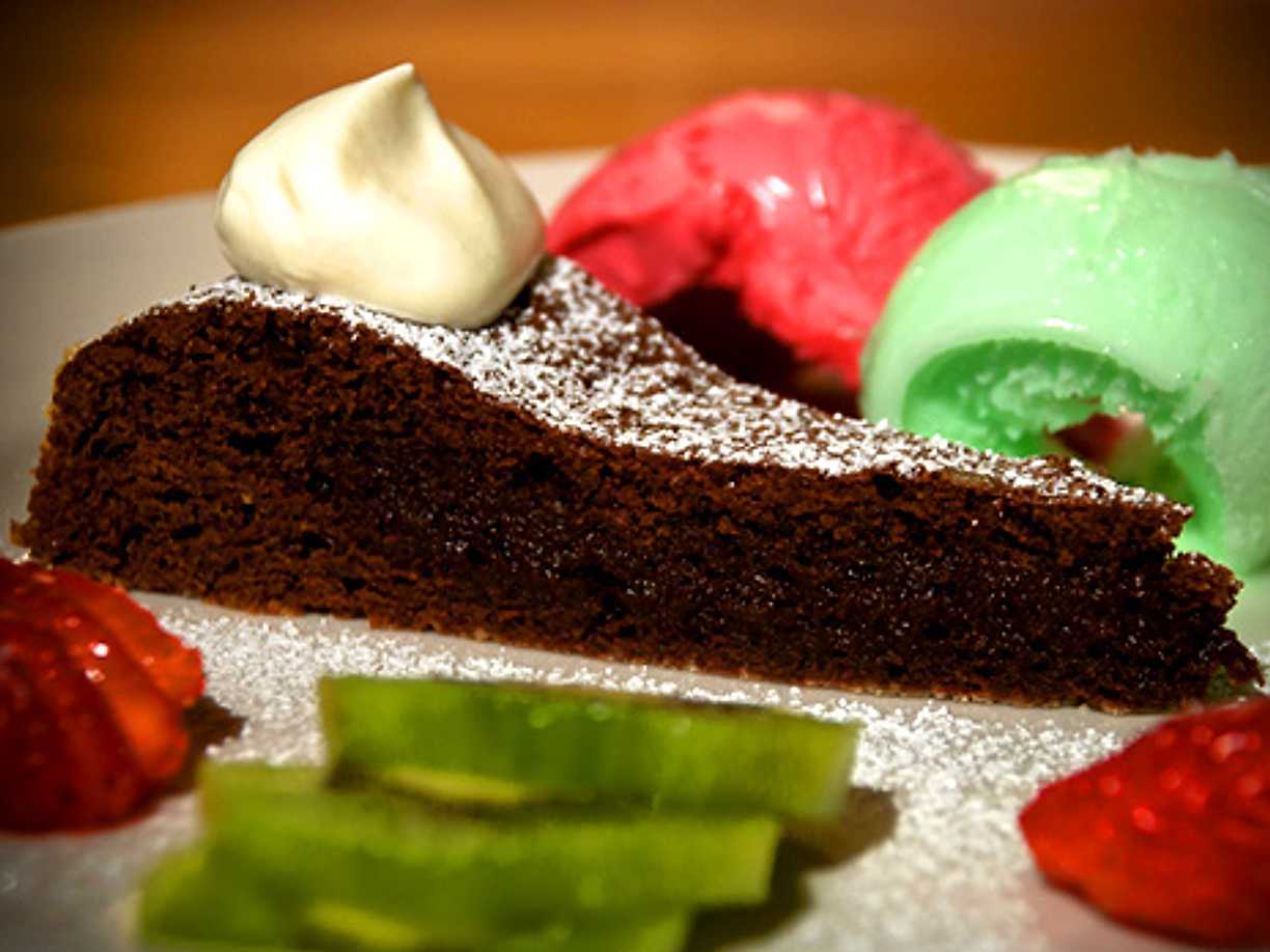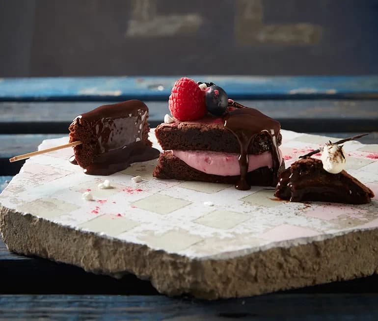 Kladdkaka med kaktus- och hallonsorbet, färska jordgubbar, kiwi och physalis