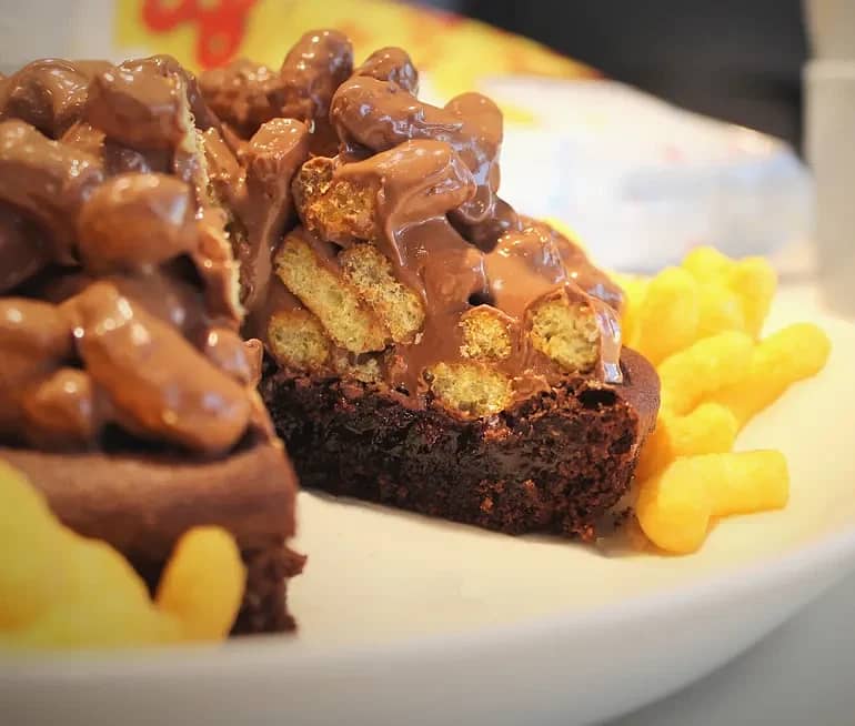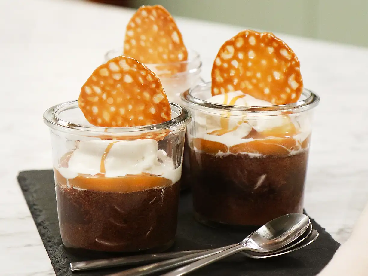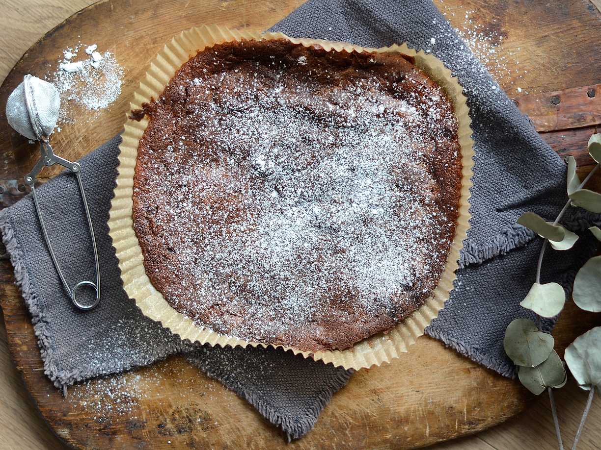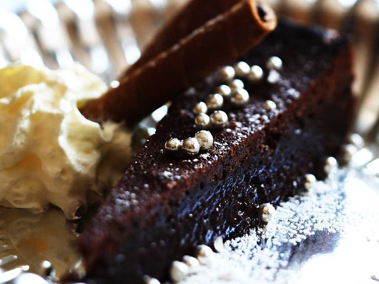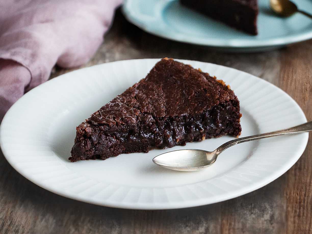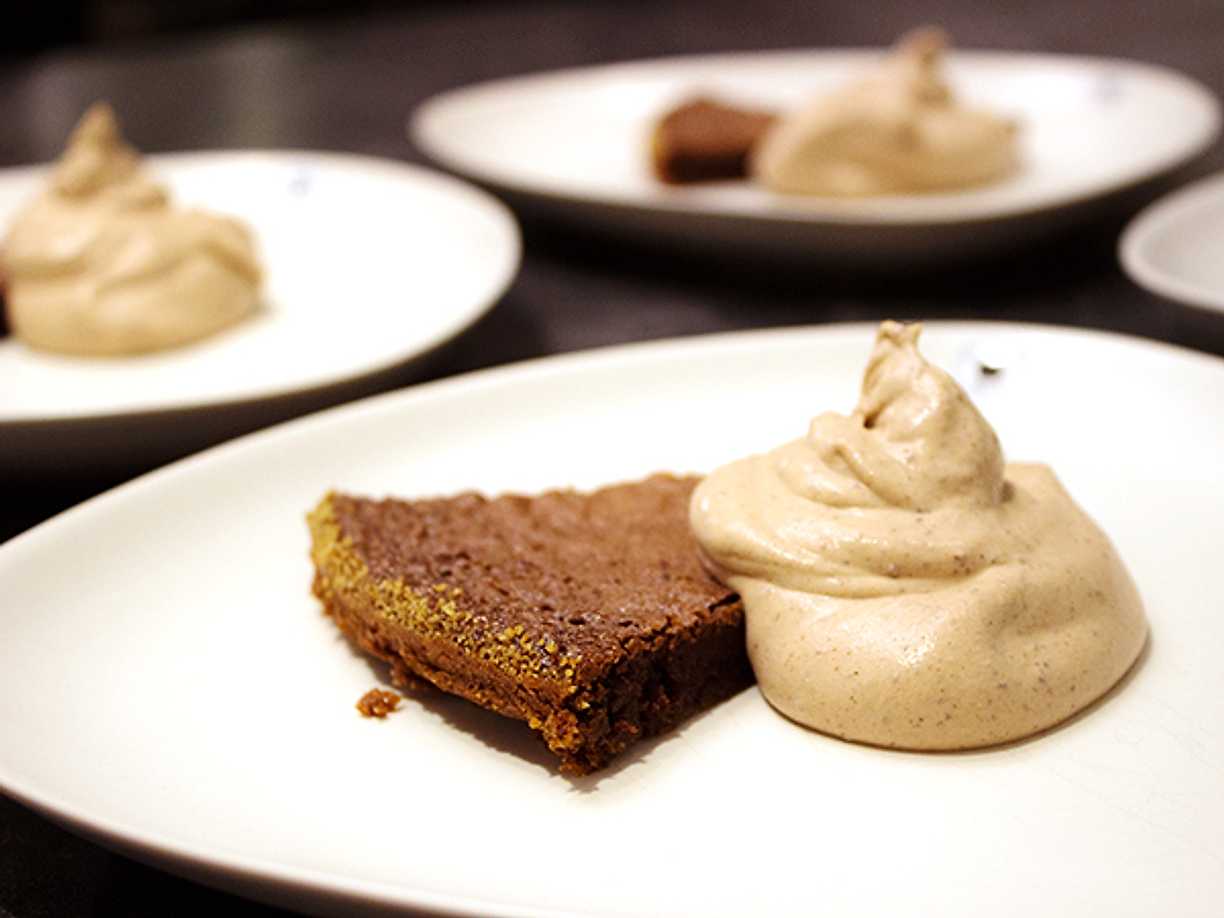 Kladdkaka med cheesecaketopping och brynt kolasås