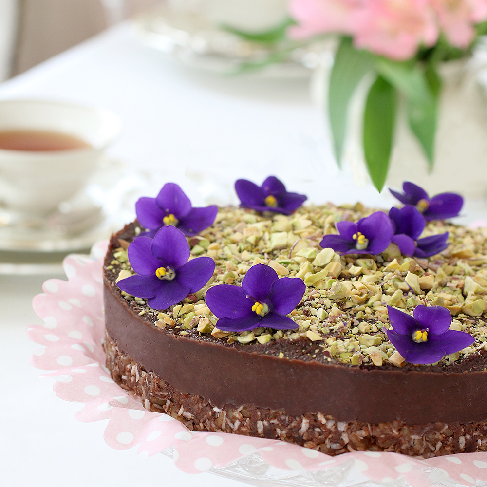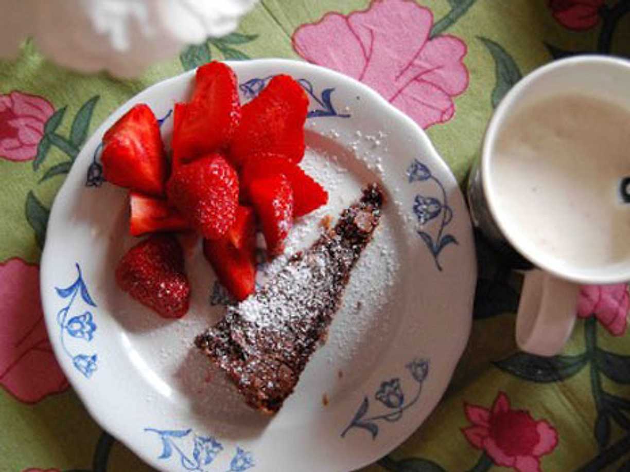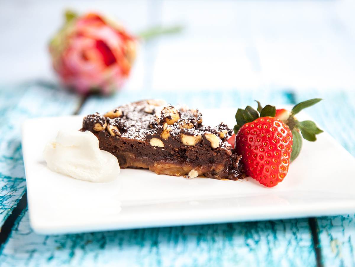 GI kladdkaka med pistagenötter, grädde och jordgubbar