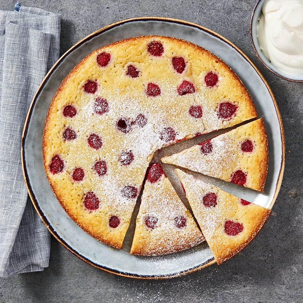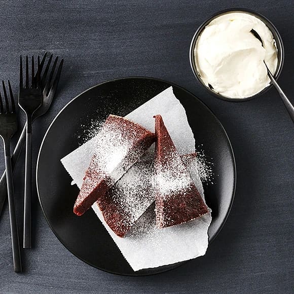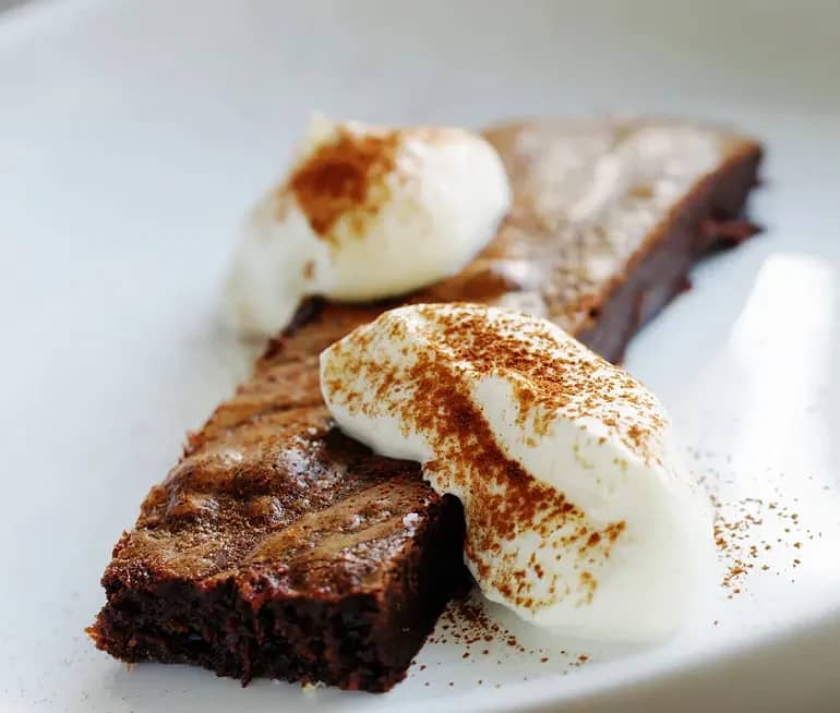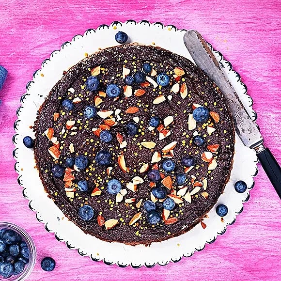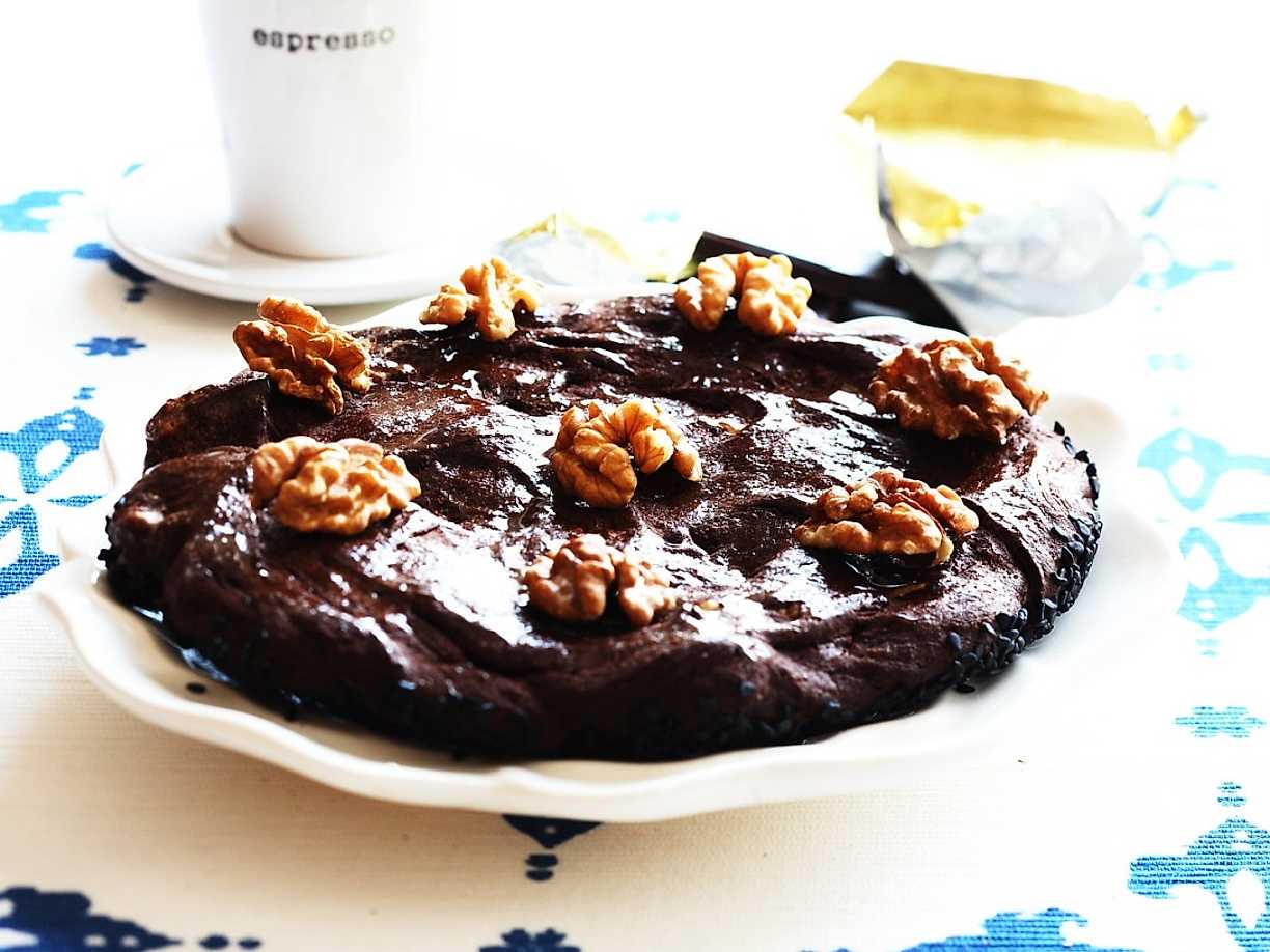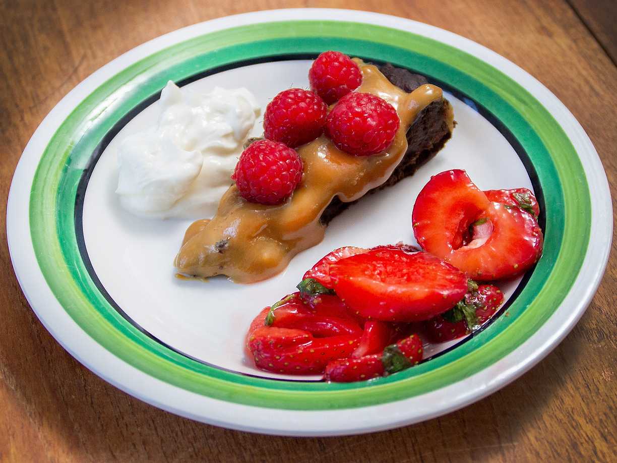 Kladdkaka på svarta bönor med kolakräm och hallon