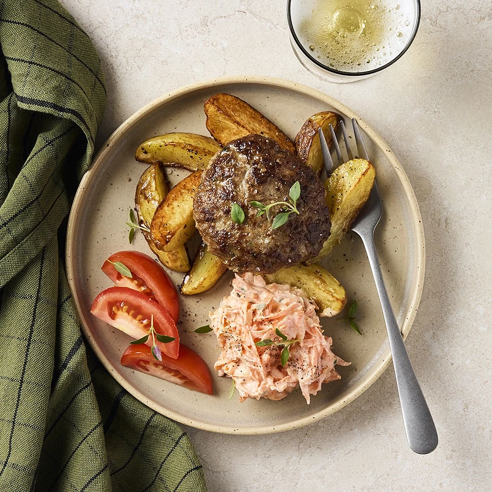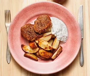 Färsbiffar med klyftpotatis och äppleyoghurt